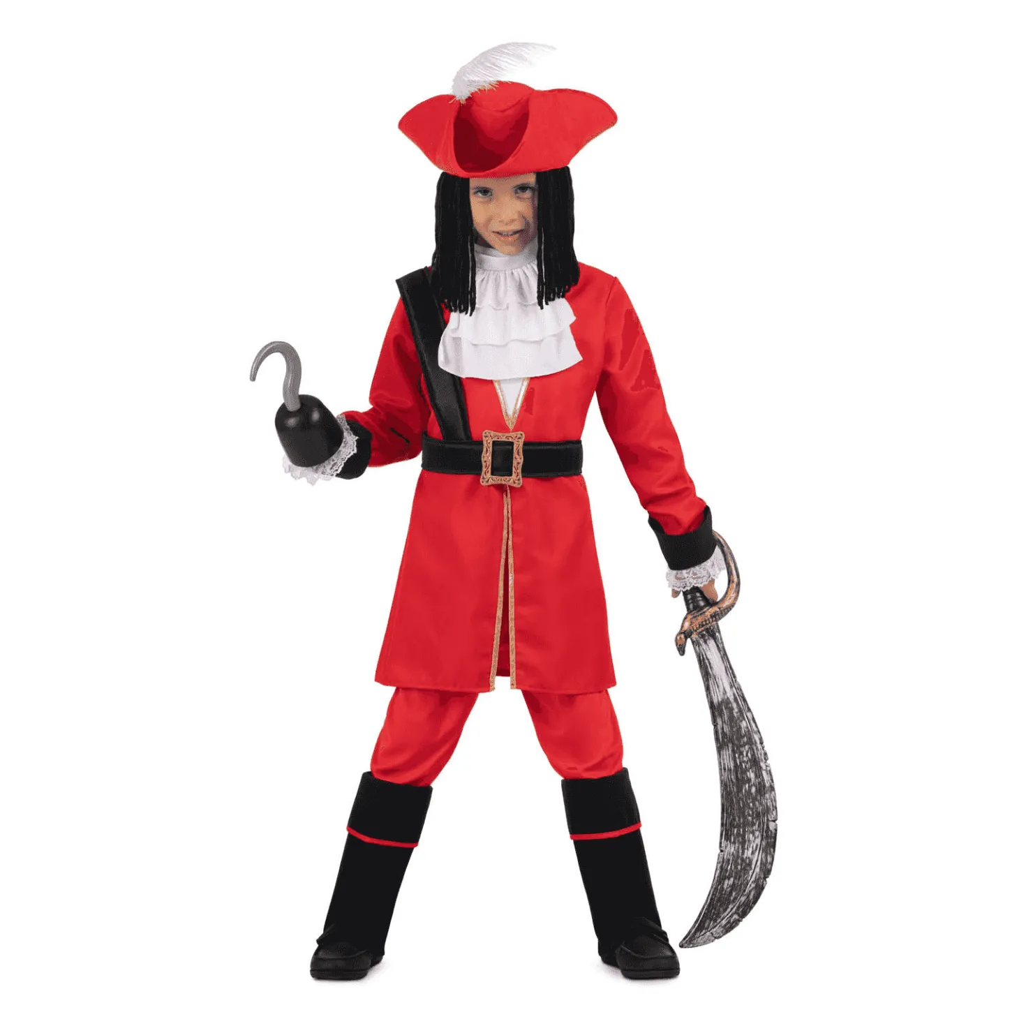 ¿Qué incluye? incluye sombrero con peluca textil, chaqueta, cuello, garfio, pantalón, cinturón y polainas.