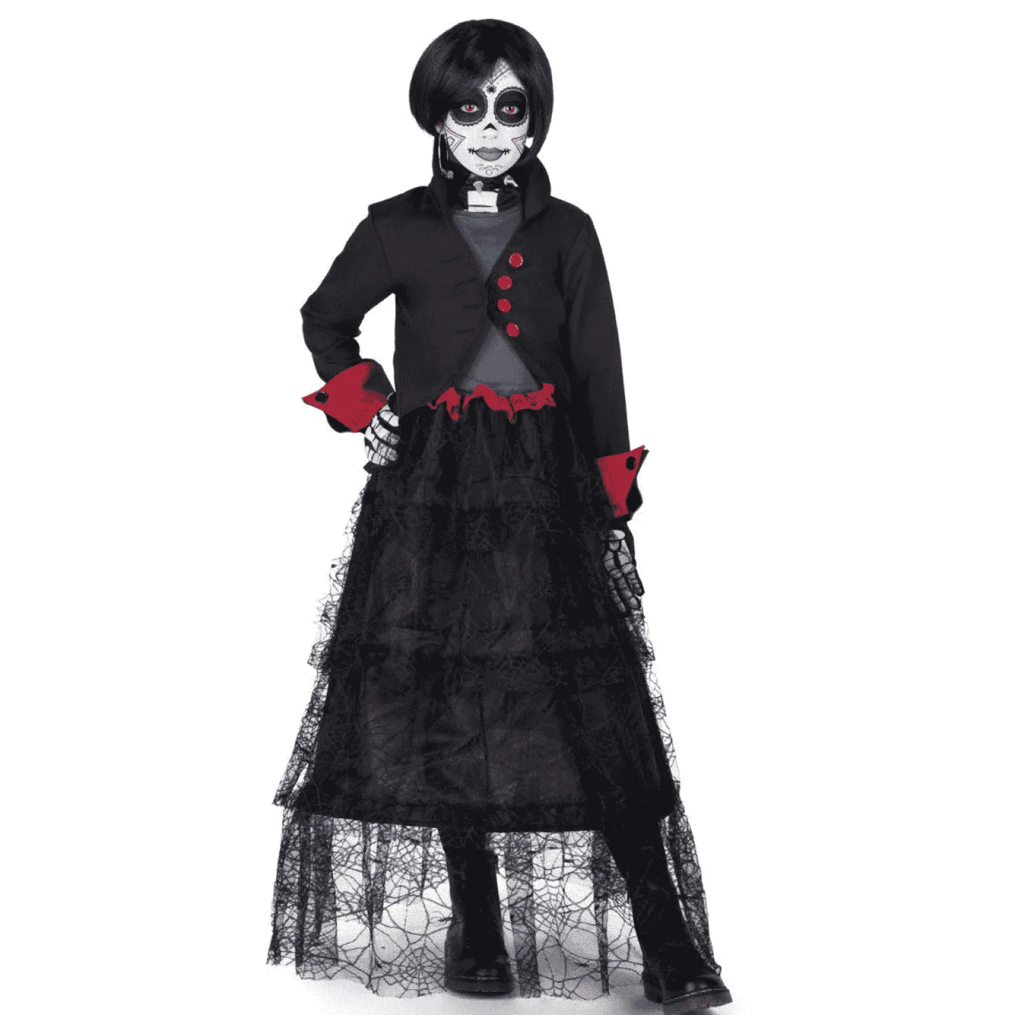 ¿Qué incluye? incluye vestido, chaqueta, guantes, chorrera esqueleto, gargantilla, peluca, 2 sets de tattoos, esponja, maquillaje blanco y maquillaje negro.