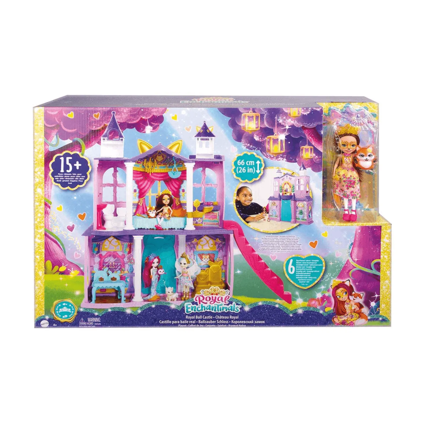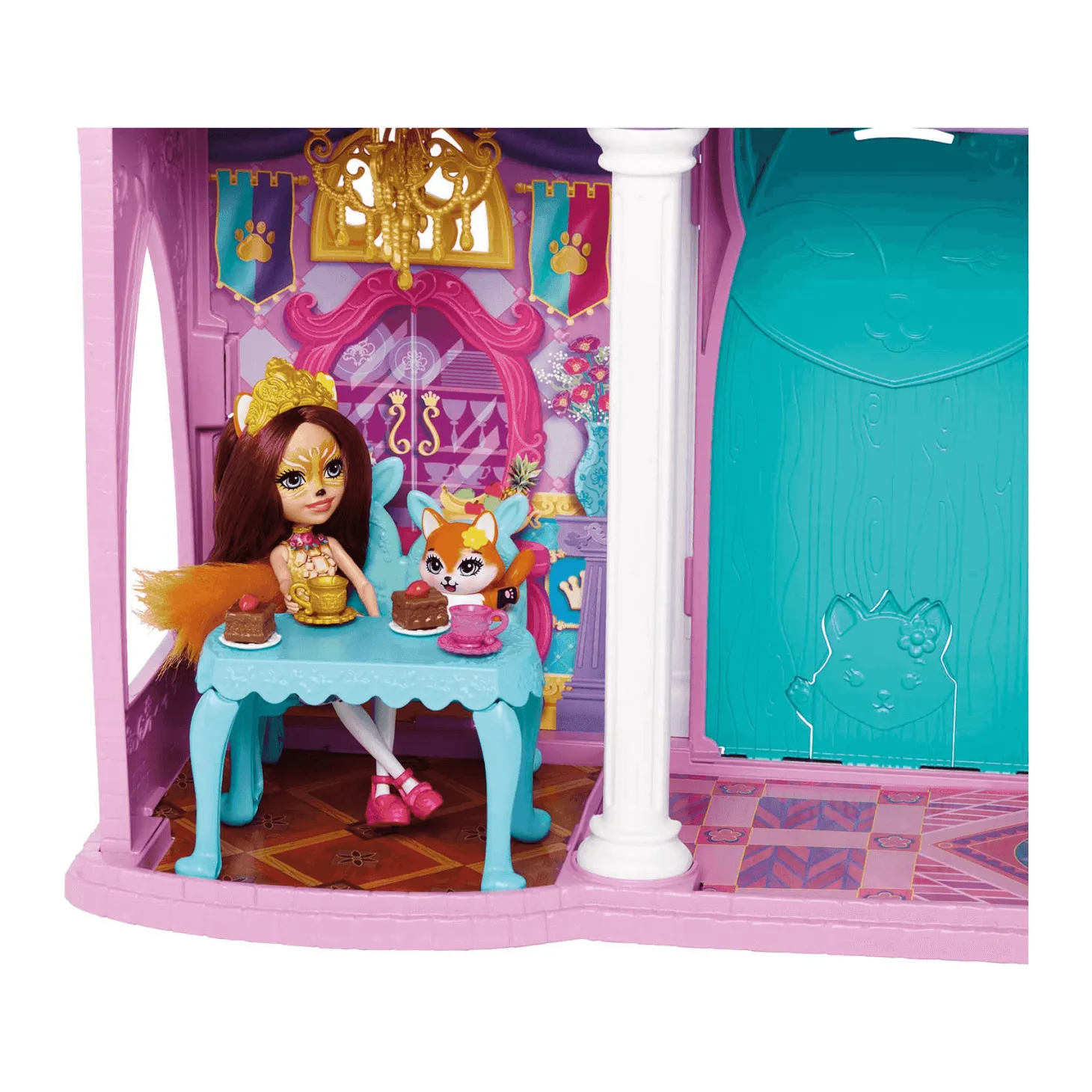 Armado, este castillo tiene una altura de 66 cm. Está diseñado con cinco espacios repartidos en dos niveles. Cuenta con una escalera que permite acceder del nivel de abajo al superior. Cada ambiente tiene su propio mobiliario acorde con la intención de uso. Tiene un salón del trono, comedor, aposentos, sanitario y salón de té. En los aposentos reales, hay un columpio para Flick y una tumbona para Felicity Fox. ¡Diviértete con Enchantimals!