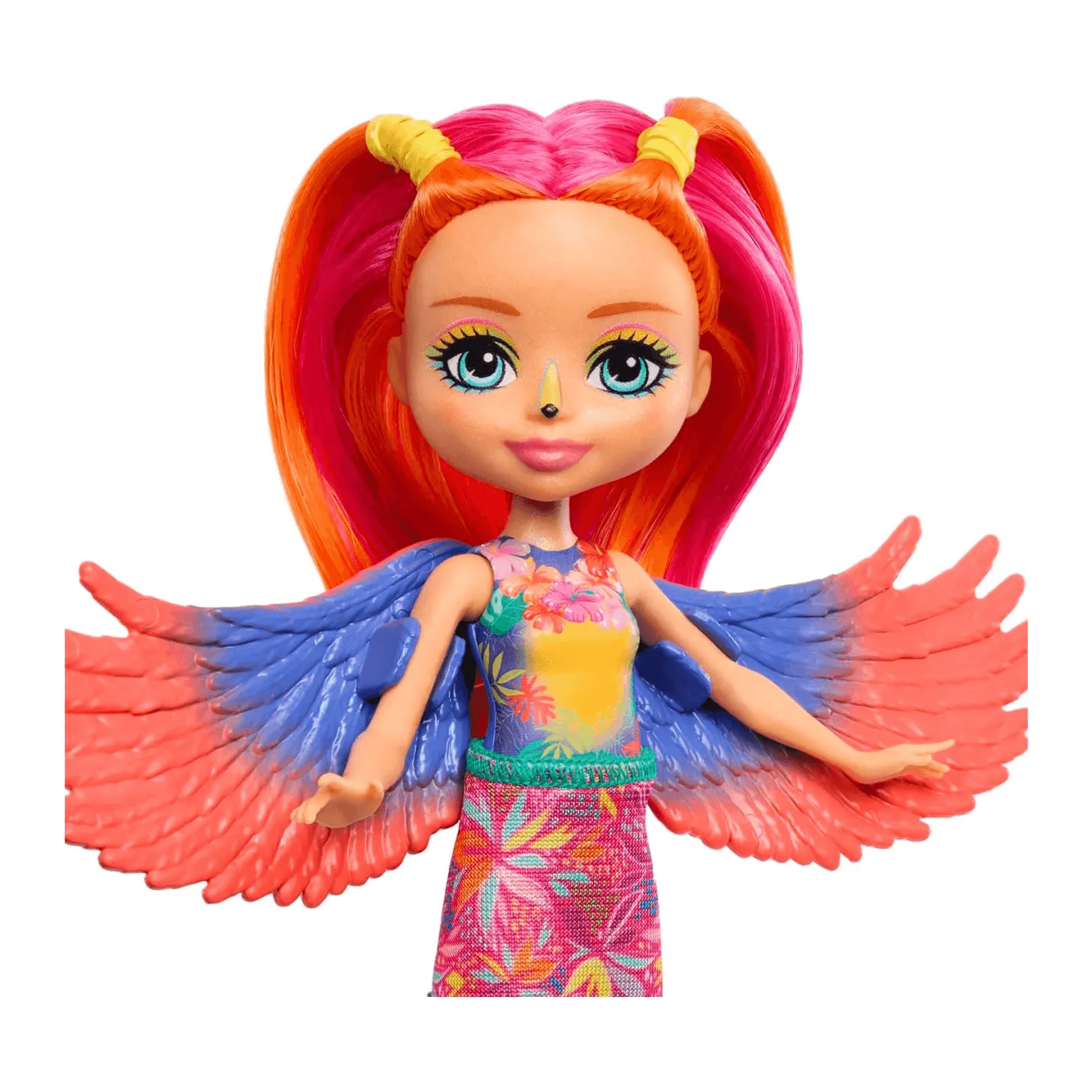 - Características mágicas y rasgos de animales: La muñeca presenta detalles inspirados en el tucán, como alas y motivos en su rostro, lo que resalta su relación con el animal y agrega un toque de fantasía al juego.