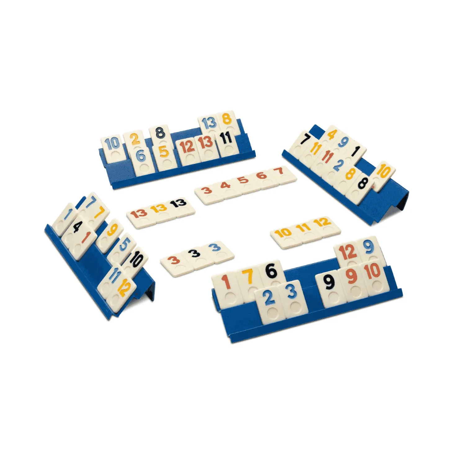 El juego de fichas numéricas. ¡Agudiza tu ingenio y sé el primero en poner todas tus fichas en el tablero! Deberás crear combinaciones de números y colores para quedarte sin fichas antes que nadie. De 2 a 4 jugadores. Incluye 106 fichas y 4 estantes. Recomendado para +6 años.