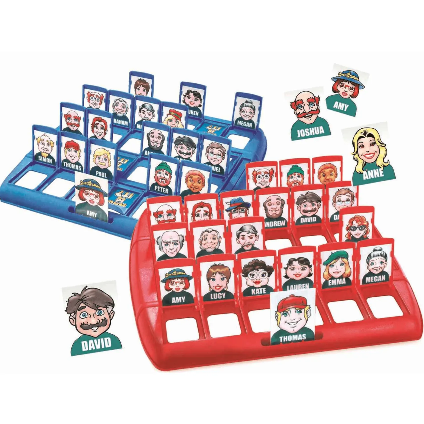Está formado por dos tableros de plástico duro, uno rojo y uno azul, de 5.0 cm de alto, 29.5 cm de ancho y 32.4 cm de largo. Cuenta con 48 tarjetas rectangulares pequeñas que son repartidas equitativamente en ambos tableros, con los 24 personajes para cada jugador, debiendo ser colocado cada recuadro en las pestañas individuales que el participante puede accionar subiendo y bajando ligeramente.