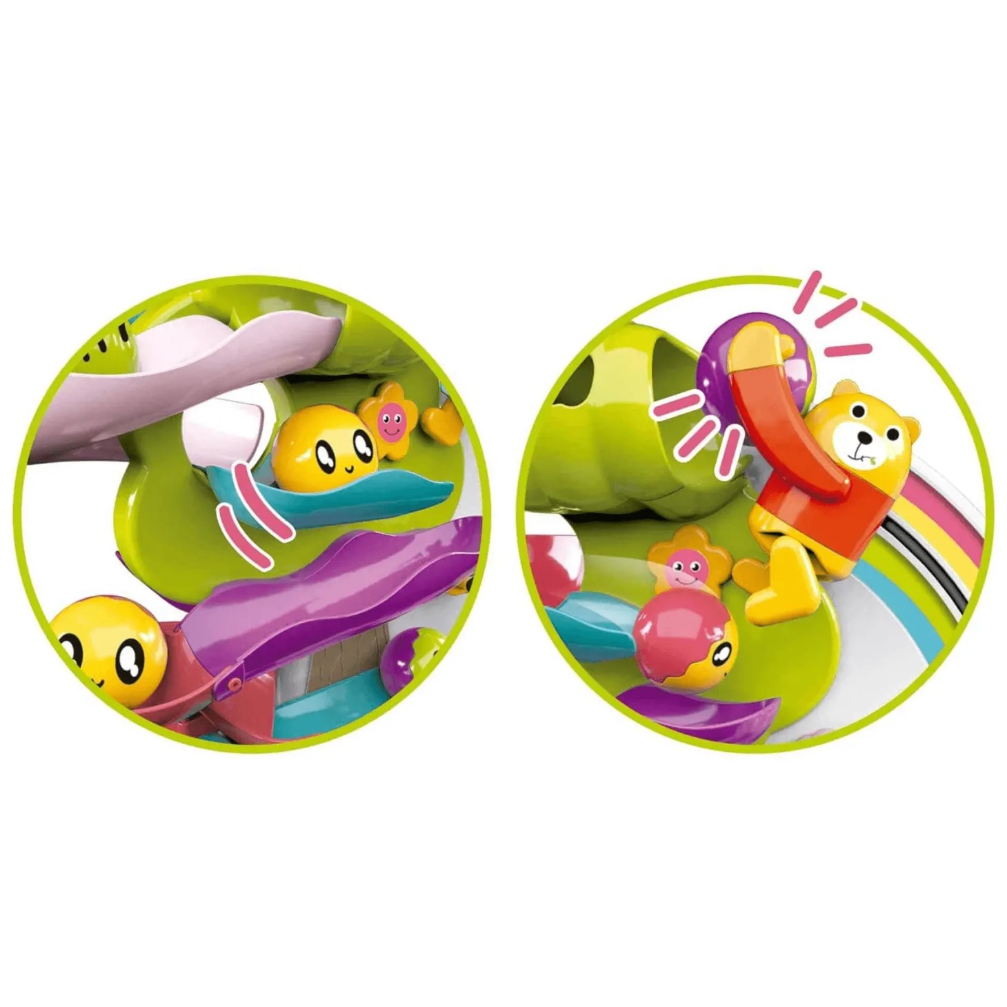 Con un osito sonriente en la parte superior y bolas coloridas que serpentean por la pista. Los niños pueden verse claramente entusiasmados con este juguete. Los colores brillantes y la forma atractiva del osito llamarán la atención de los niños y los animarán a jugar con esta pista de bolas. Además es un juguete educativo: Esta pista de bolas fomenta la imaginación y el desarrollo motor de los niños.