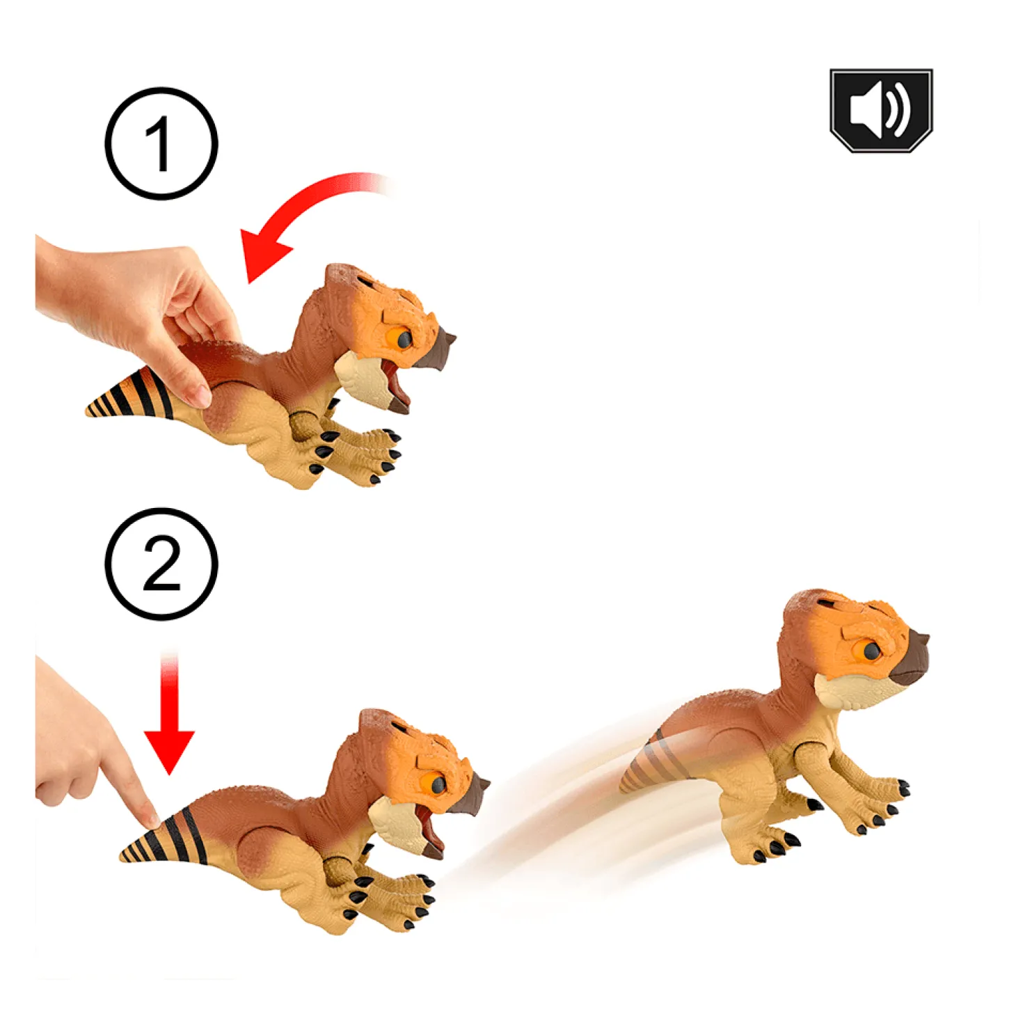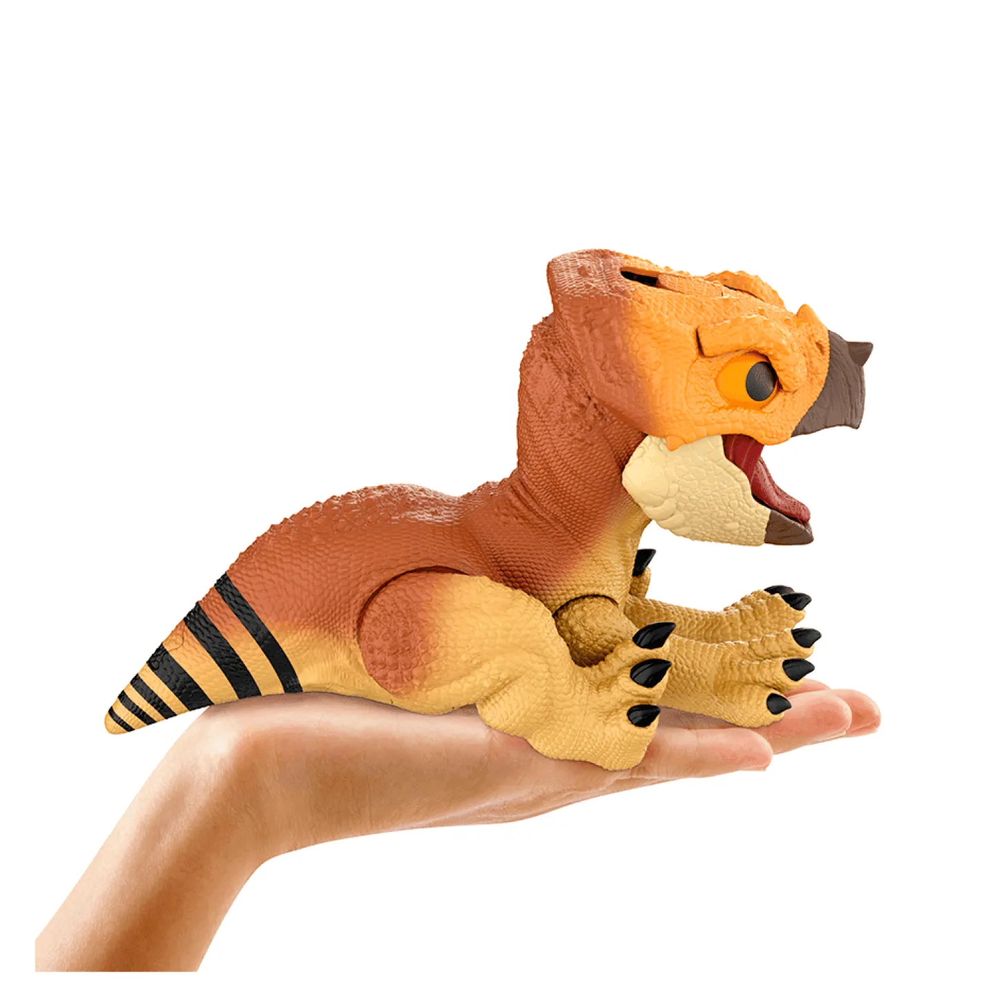 - Reacción a las caricias: Domestica a tu dinosaurio tocando su cabeza. Su expresión se suaviza, abre la boca y está listo para recibir un dulce de premio.