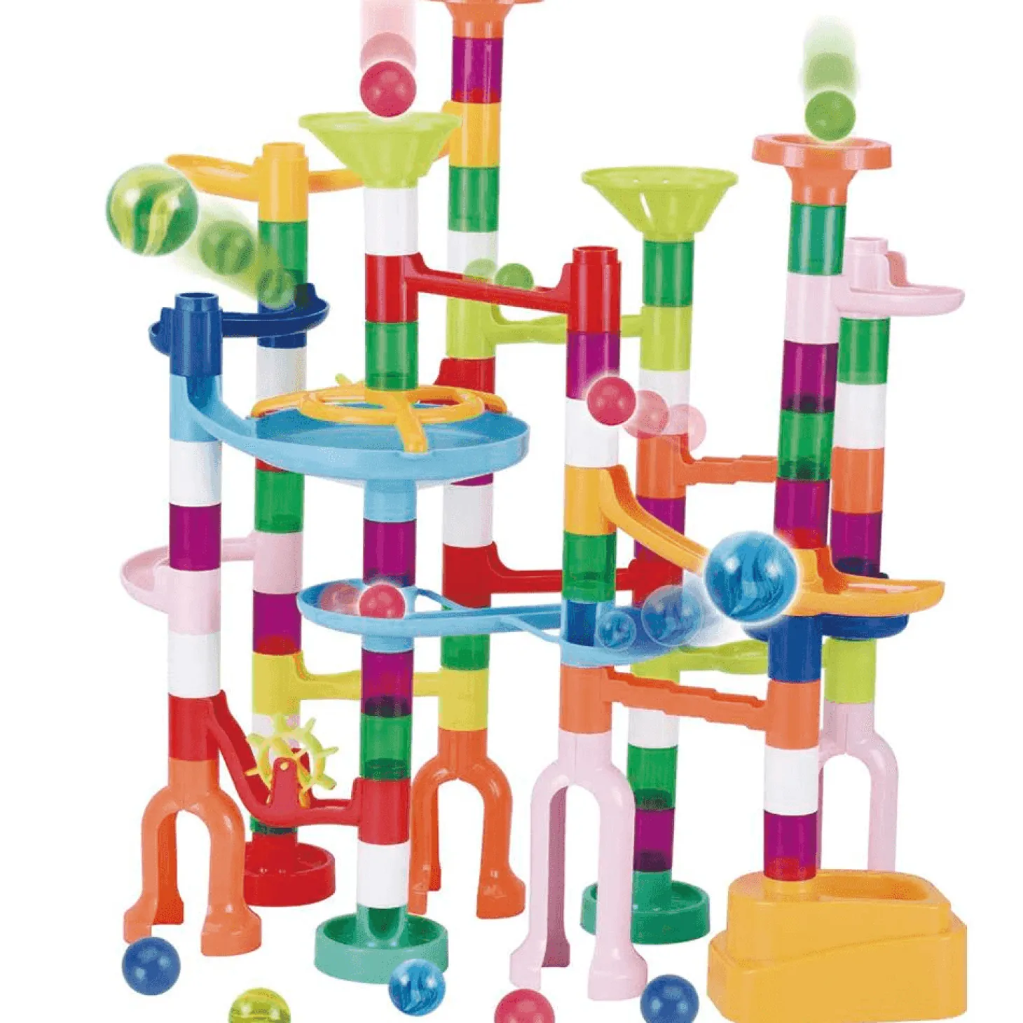105 piezas de construcción en plástico resistente y canicas para poner en marcha la carrera.