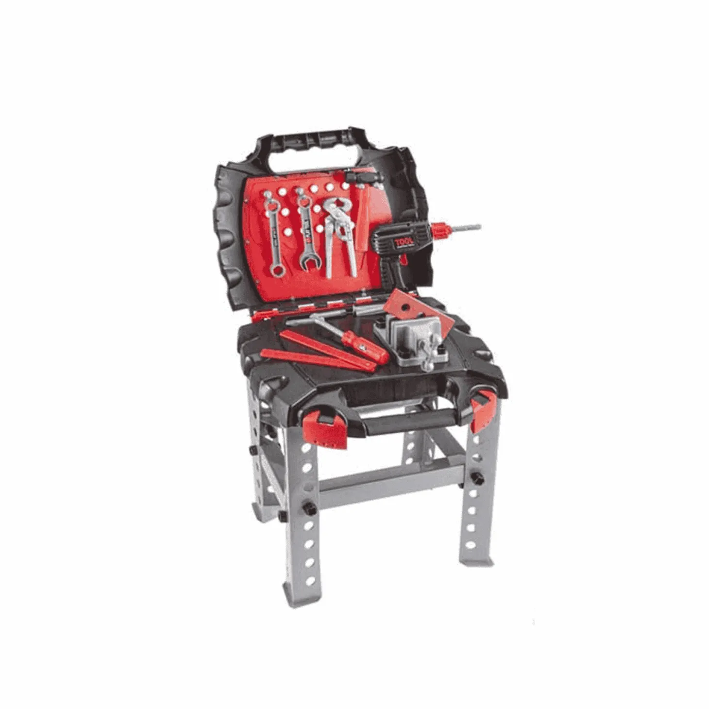 Las herramientas, maletín y mesa de trabajo están fabricados con plástico resistente. El set dispone de diversos instrumentos, como un martillo o sierra, entre otros utensilios.