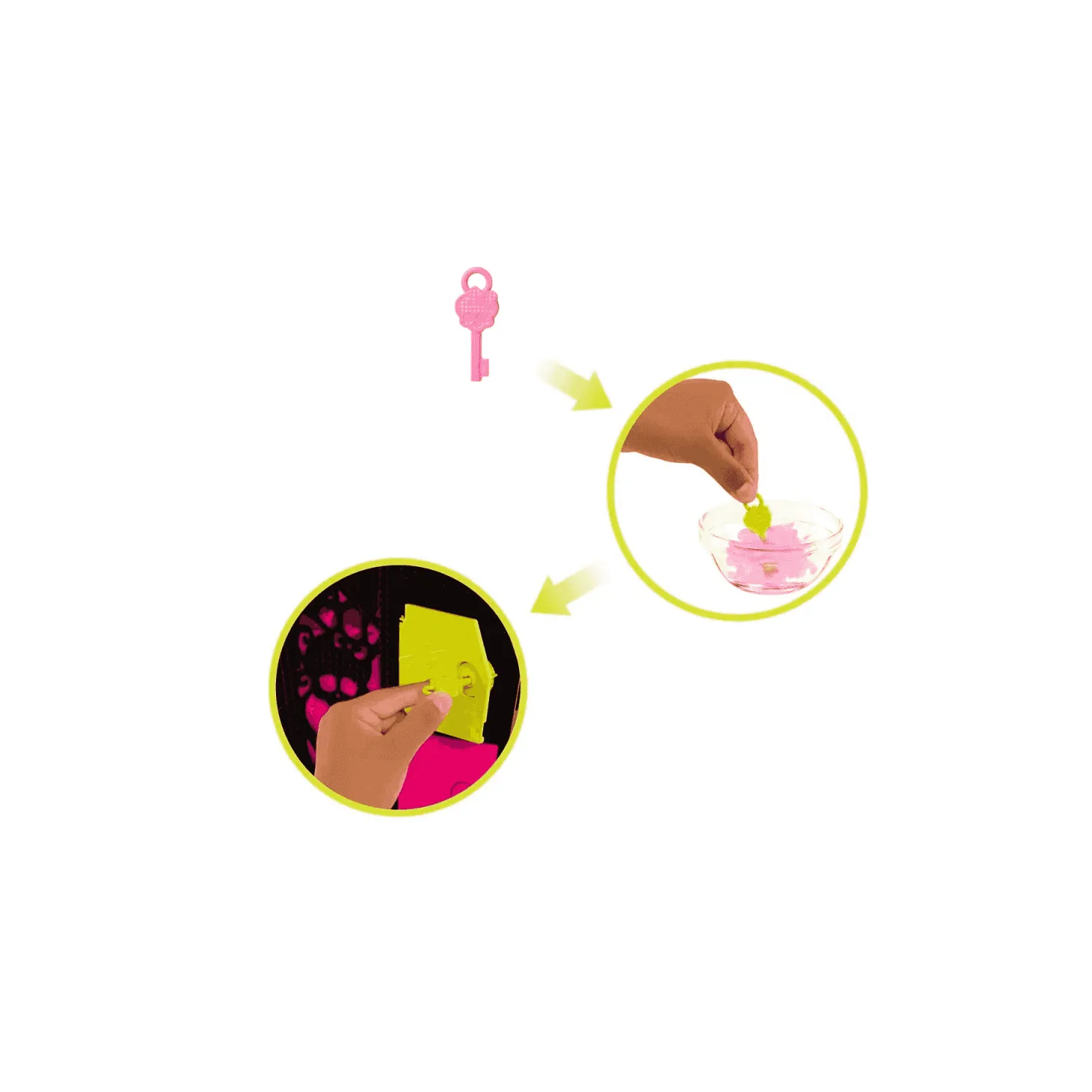Abre la taquilla de Draculaura y sumérgete en un mundo de sorpresas de moda y accesorios fantásticos. Las cuatro llaves Color Reveal te invitan a descubrir los objetos ocultos en su interior. ¡Apaga las luces para descubrir tres accesorios que brillan en la oscuridad!