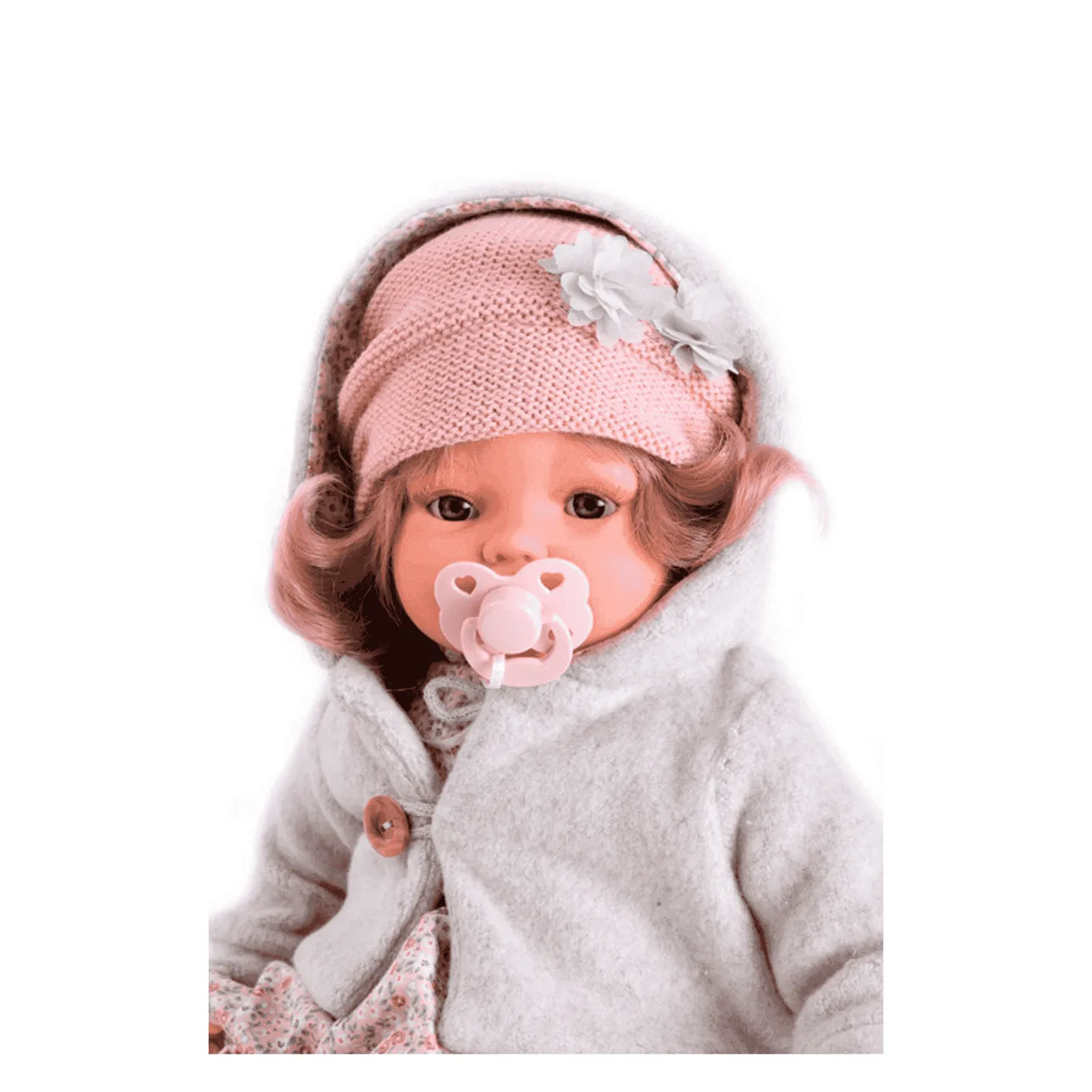 - Incluye abrigo gris con capucha, vestido de flores, culotte, gorro, calcetines y chupete.