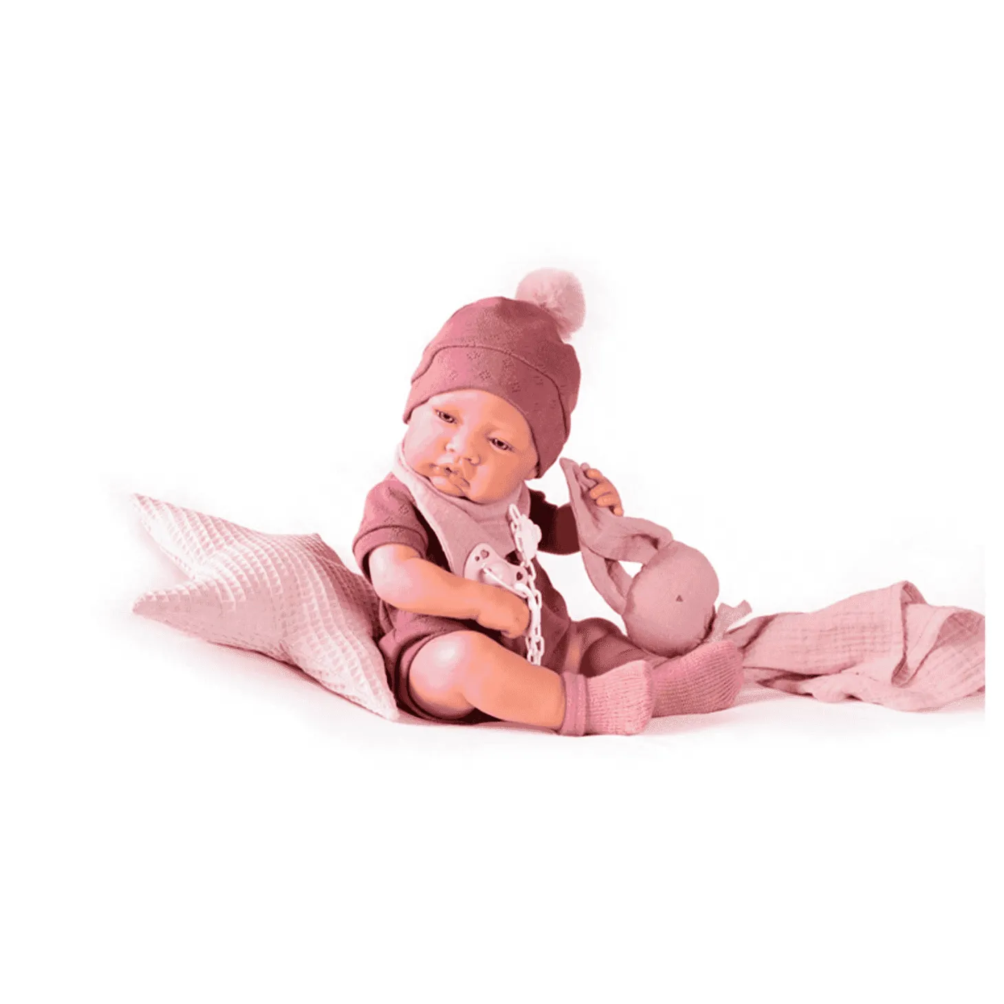 Esta Muñeca Recién Nacida está lista para disfrutar de un día lleno de juegos y mimos con su precioso pelele a juego con su gorrito con pompón. Cuando llega la hora de descansar, le encanta acurrucarse sobre su cojín con forma de estrella y abrazar a su dou dou conejito, su compañero inseparable para los momentos de sueño.