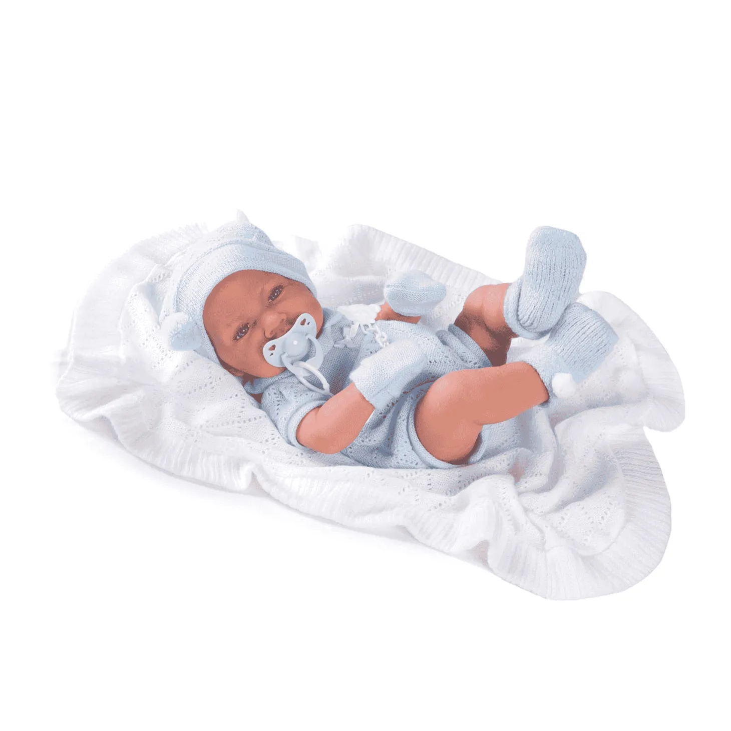 Este adorable bebé Recién Nacido está esperando a que lo tomes en brazos y lo envuelvas en su suave toquilla blanca. Con su ropita de punto en azul, manoplas y calcetines a juego, parece un auténtico bebé al que no podrás dejar de abrazar. Su cuerpo de vinilo sexuado le aporta aún más realismo, convirtiéndolo en el compañero ideal para juegos de simulación y cuidados de bebés.