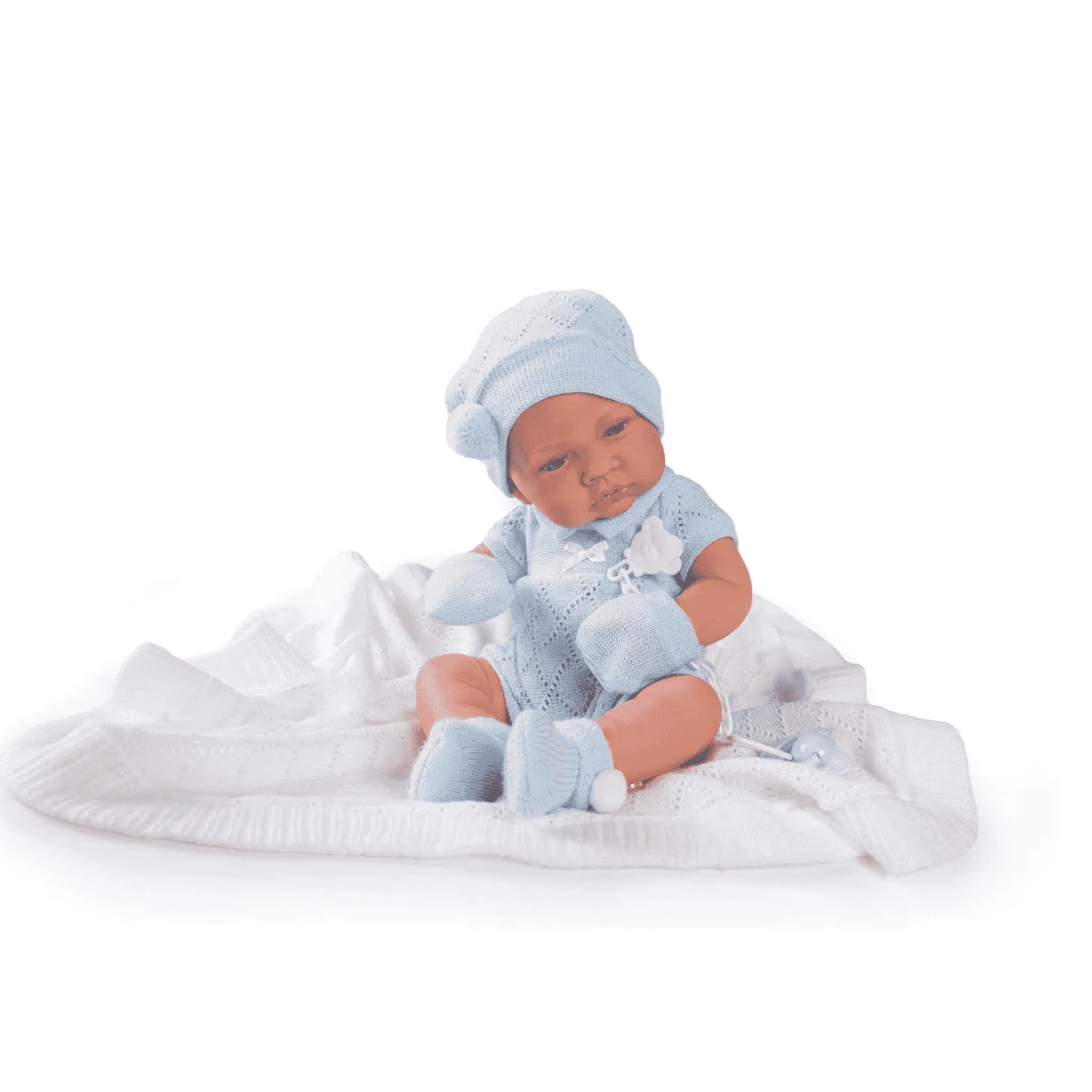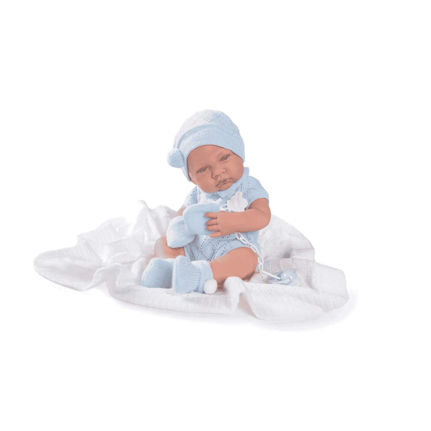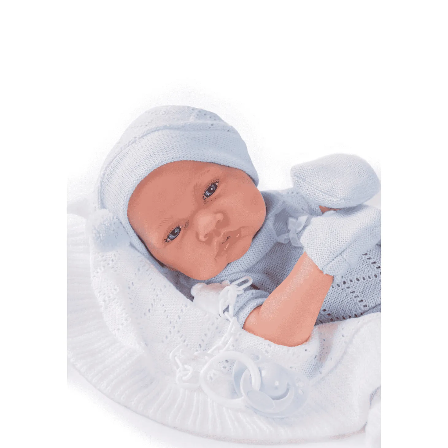 - Incluye chupete y toquilla blanca, perfectos para arrullarlo con cariño.