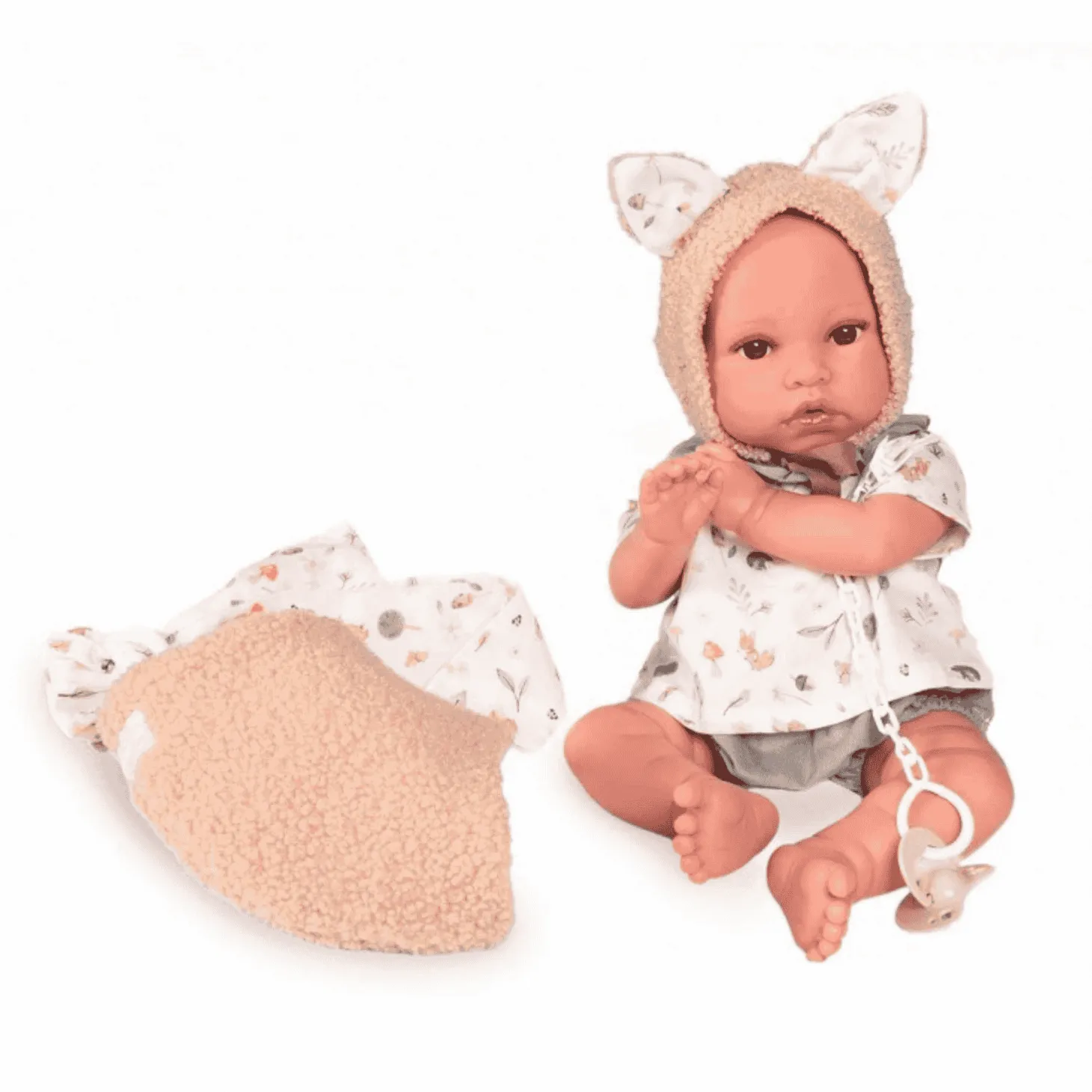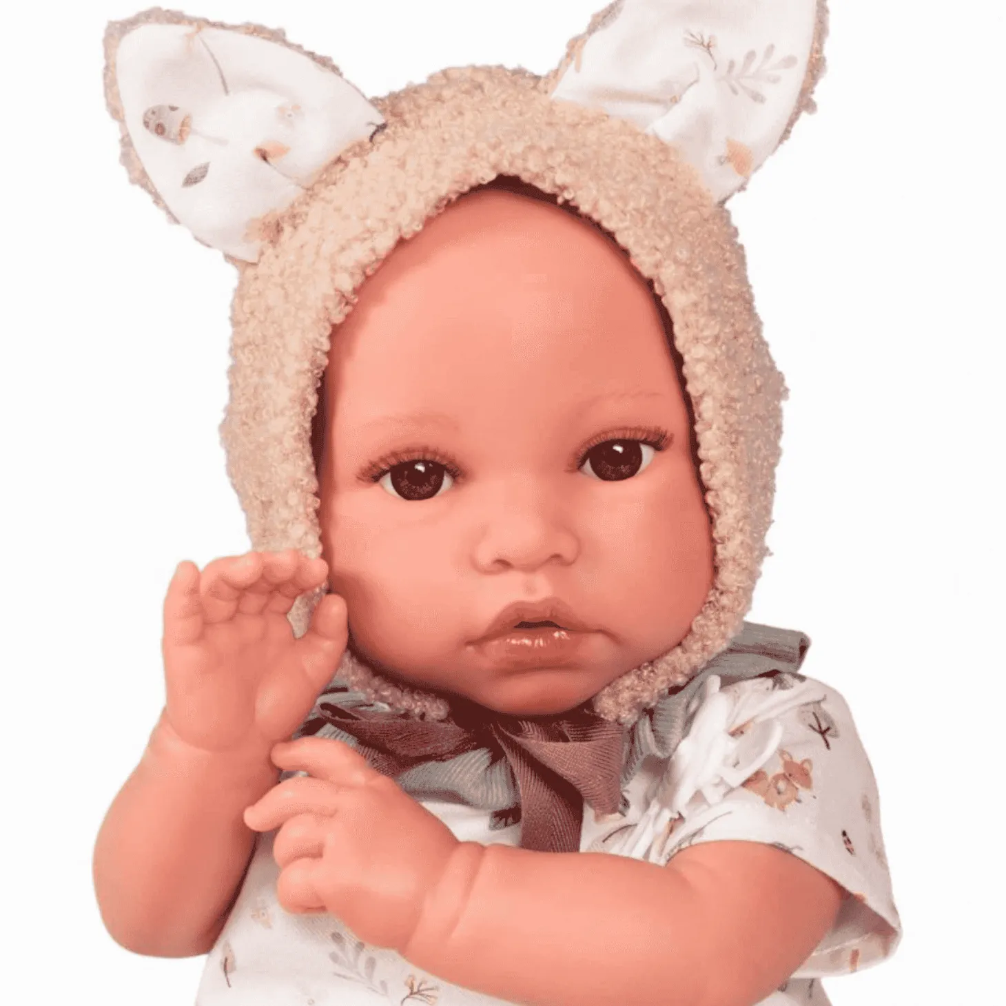 - Detalles cuidados: viene con un trajecito divertido y una capota con orejitas que le da un toque encantador.