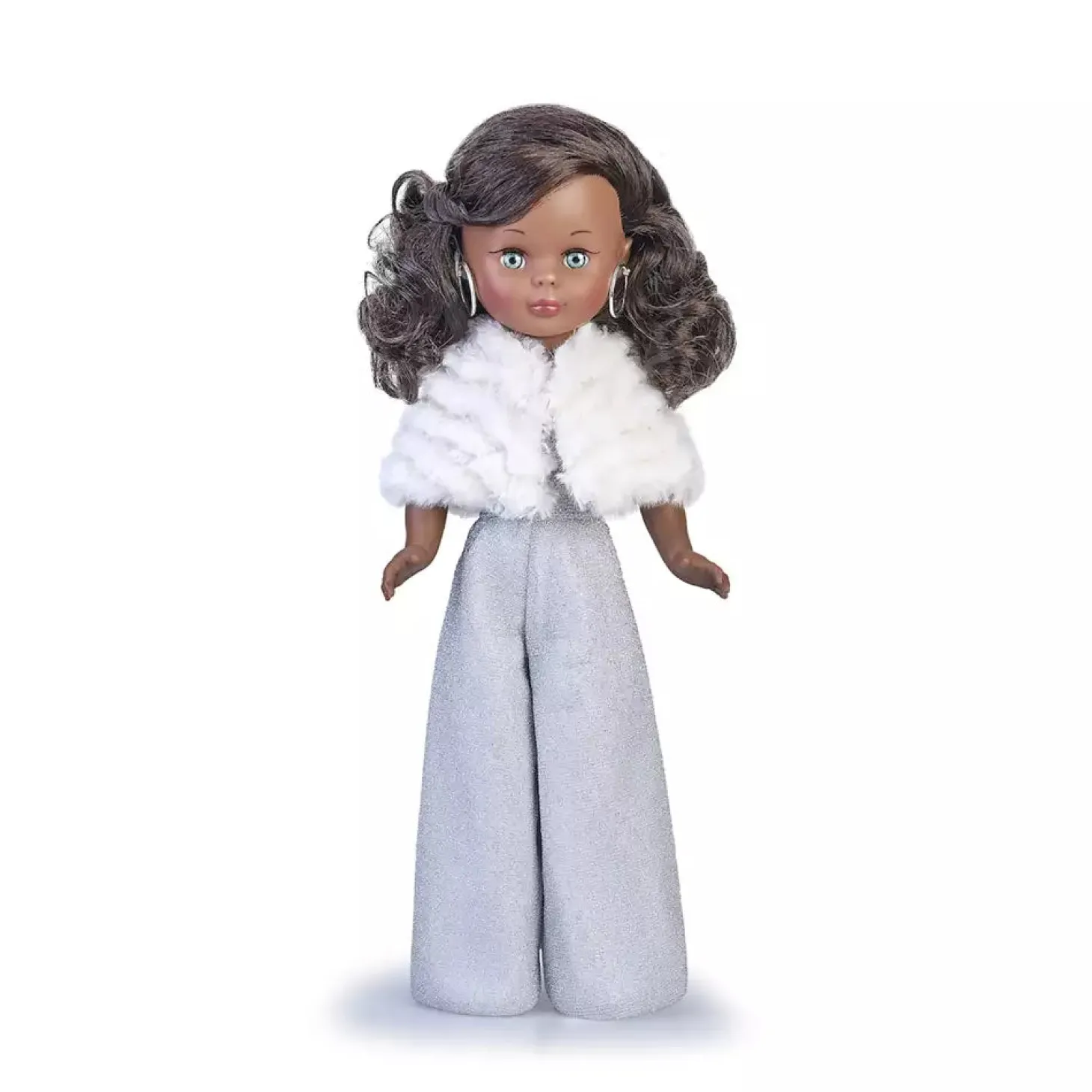 La Nancy Colección Liceo Edición 2025 regresa con el brillo y glamour de los años 70. Su mono plateado largo, chal efecto visón y peinado ondulado evocan la elegancia de la época.