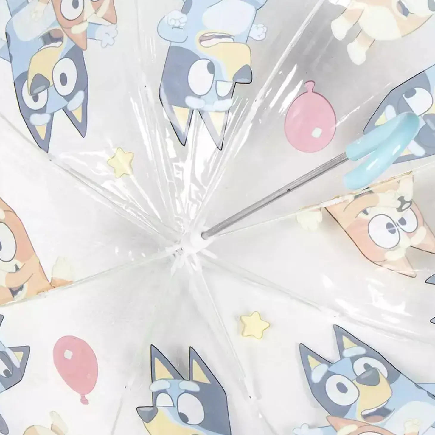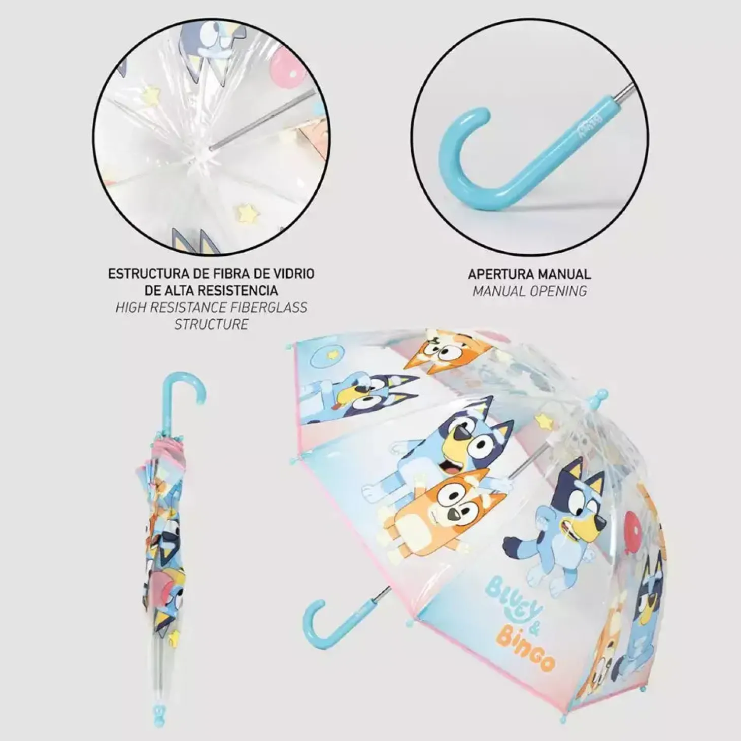 El Paraguas burbuja Bluey es el accesorio perfecto para protegerte de la lluvia con estilo. Cuenta con un diseño transparente tipo “burbuja” que cubre bien y permite ver lo que pasa fuera, además de estar decorado con tus personajes favoritos: Bluey y Bingo.