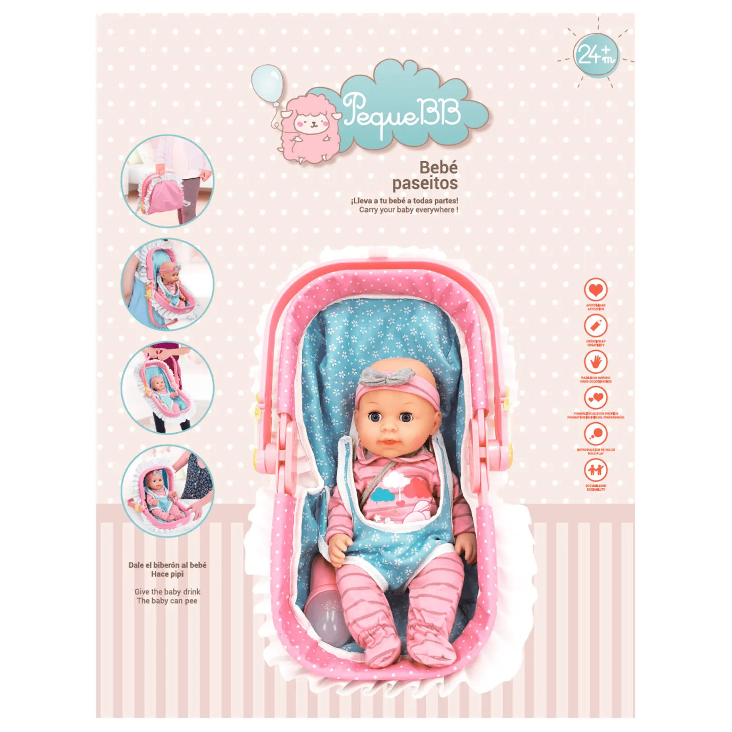 Con el transportín incluido, los niños pueden practicar el cuidado y la responsabilidad al llevar al bebé a todas partes, fomentando valores importantes desde temprana edad.