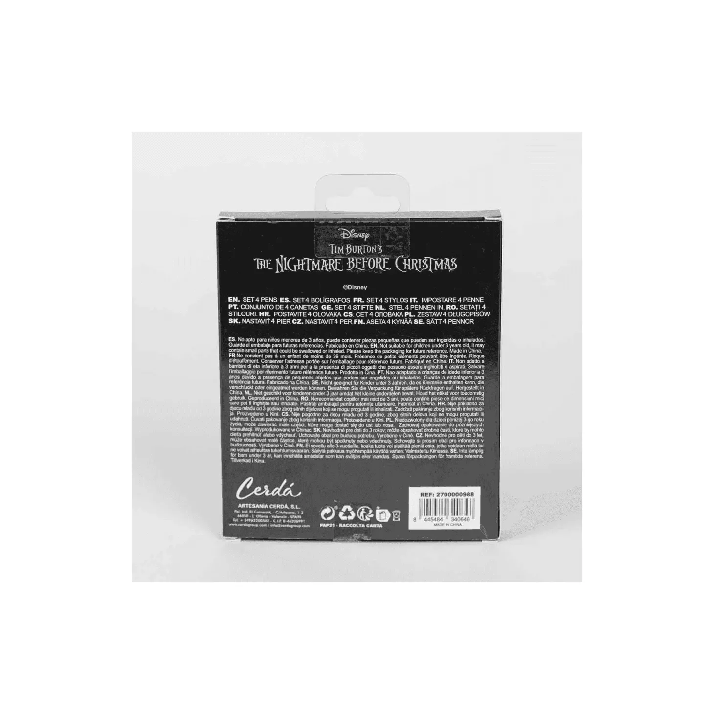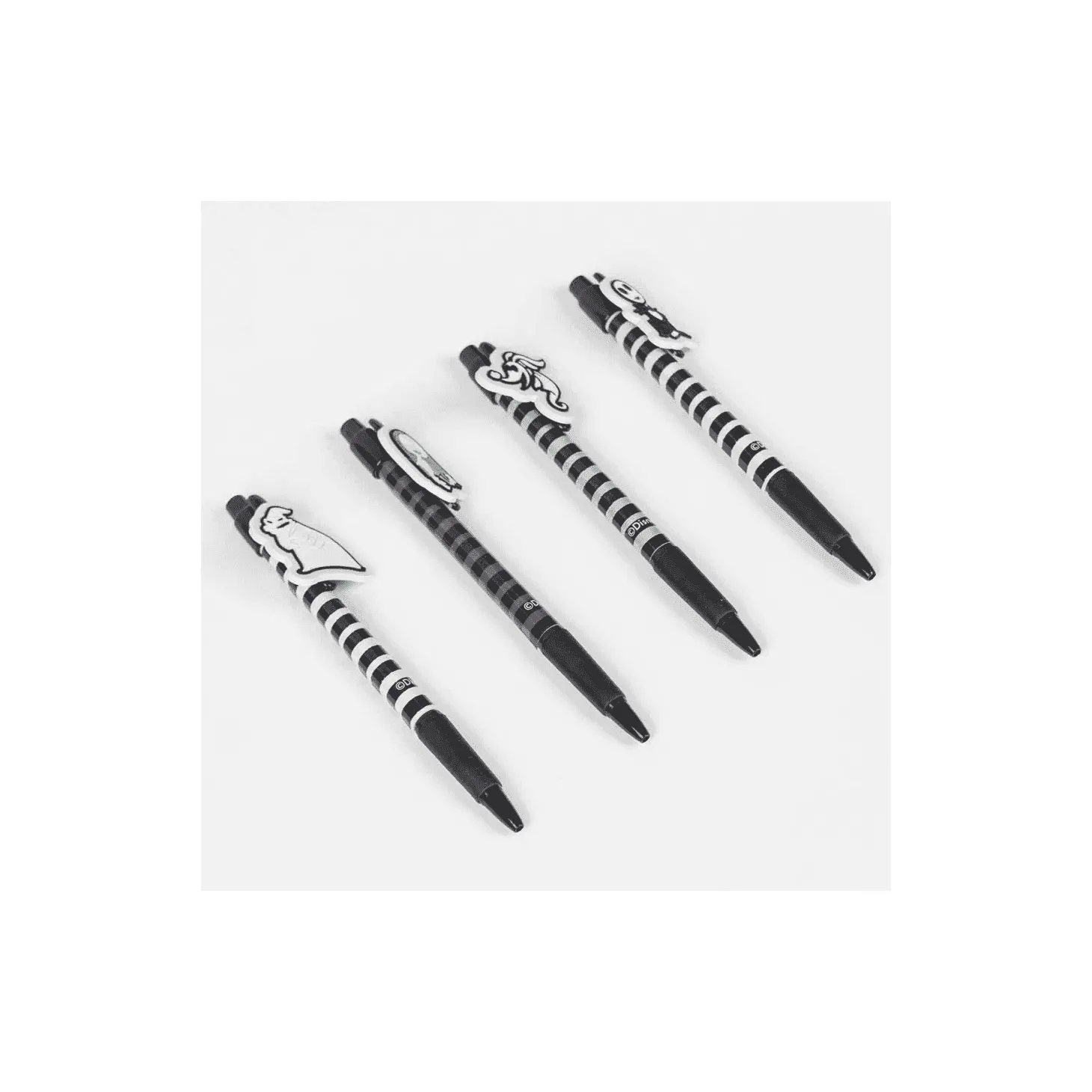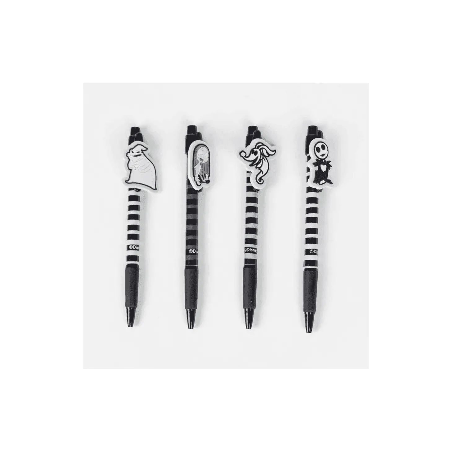 El set incluye cuatro bolígrafos con diseños únicos de los personajes más emblemáticos de la película, como Jack Skellington, Sally, el Doctor Finklestein y el Sombrerero Loco. Cada bolígrafo presenta un diseño detallado y colorido que captura la esencia de estos personajes queridos por los fans de la película.