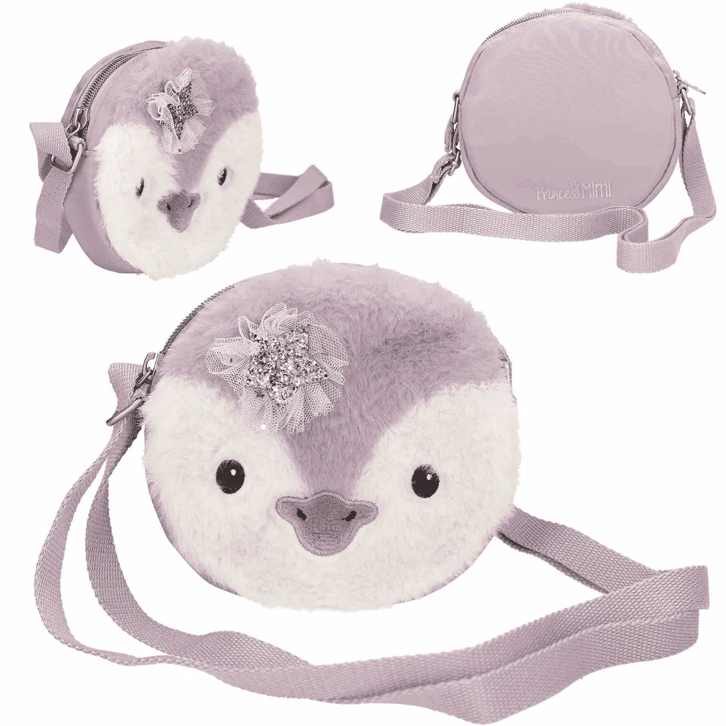 Para las princesas amantes de los pingüinos: La bandolera pequeña de Princess Mimi en colores lila ahumado y crema lleva la cara de un pingüino monísimo de peluche y una preciosa estrella brillante aplicada en la parte delantera. La bandolera de las mismas tonalidades es regulable y dispone de un botón con mecanismo de seguridad para abrirse en caso de recibir un tirón seco y brusco. El compartimento principal cierra con cremallera y lleva incorporada una cartera extraíble. Material: poliéster 100%. Material: poliéster reciclado 100%. de instrucciones de uso.