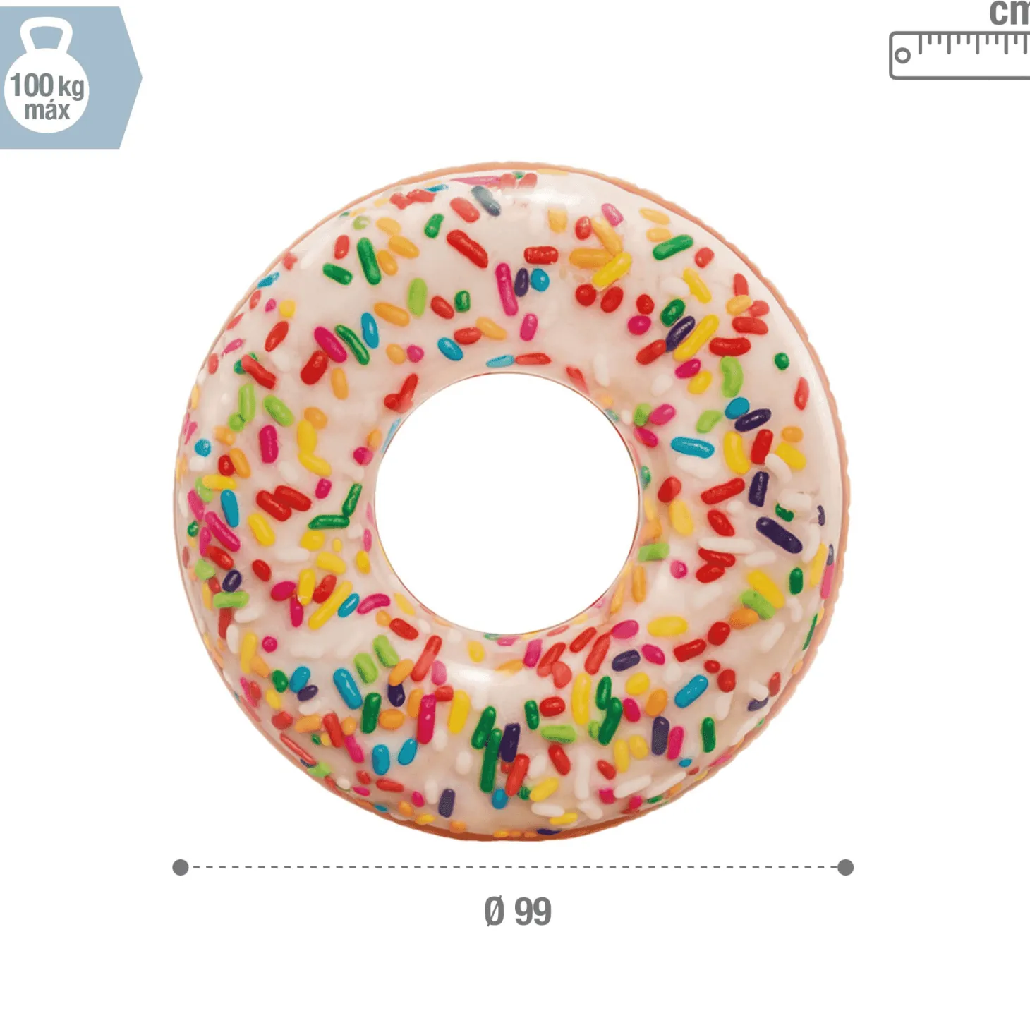 ¡Dale un toque dulce y divertido a tus días de verano con la Rueda Hinchable Donut Blanco de Intex! Con un diseño fotorrealista que imita un delicioso donut glaseado con virutas de colores, este flotador es perfecto para niños y adultos que buscan destacar en la piscina o la playa.