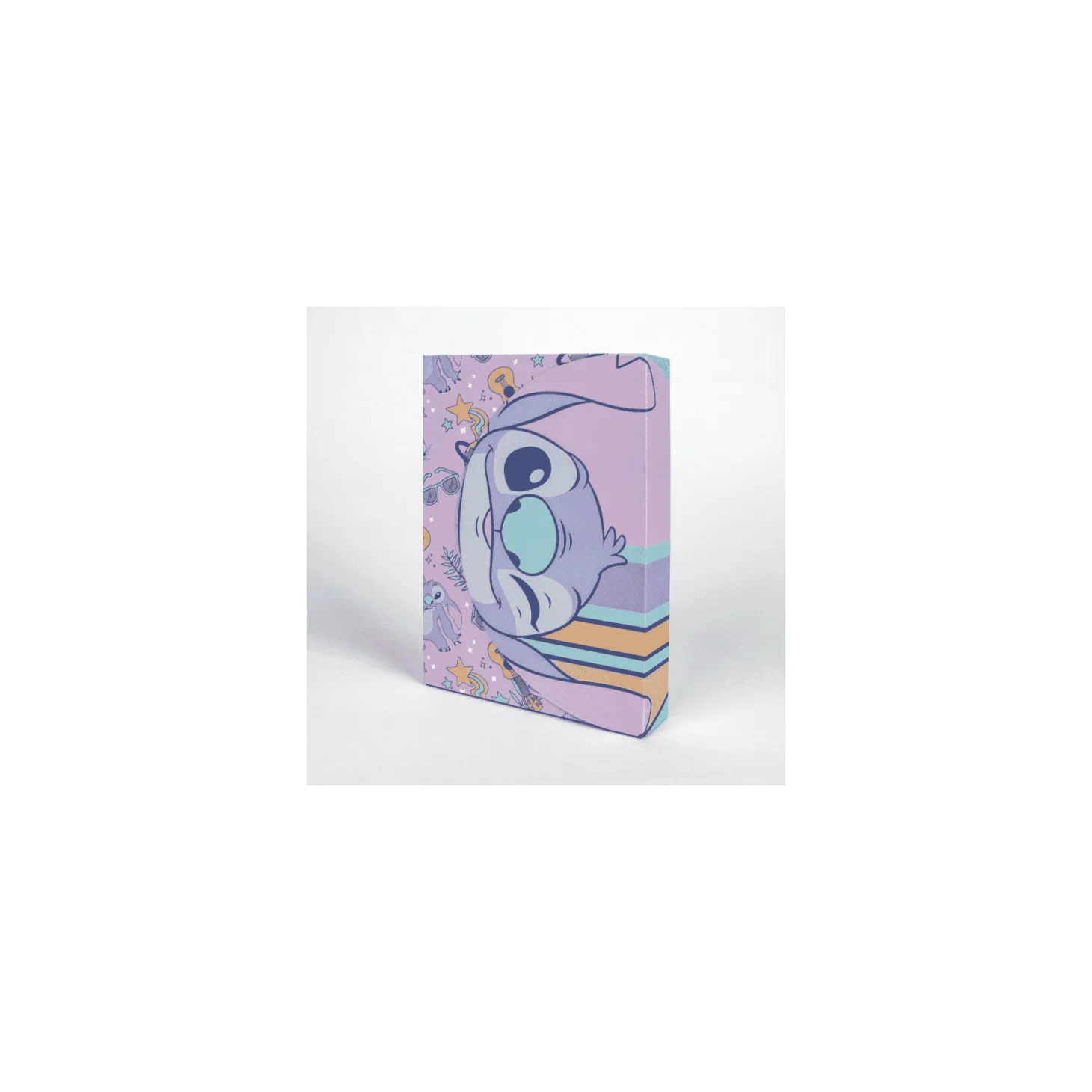 El set incluye una libreta A6, un lápiz de color, un lápiz HB, una goma y clips metálicos, todo decorado con imágenes de Stitch y su amor Angel. Con su diseño colorido y alegre, será un regalo ideal para los seguidores del mundo de Disney.