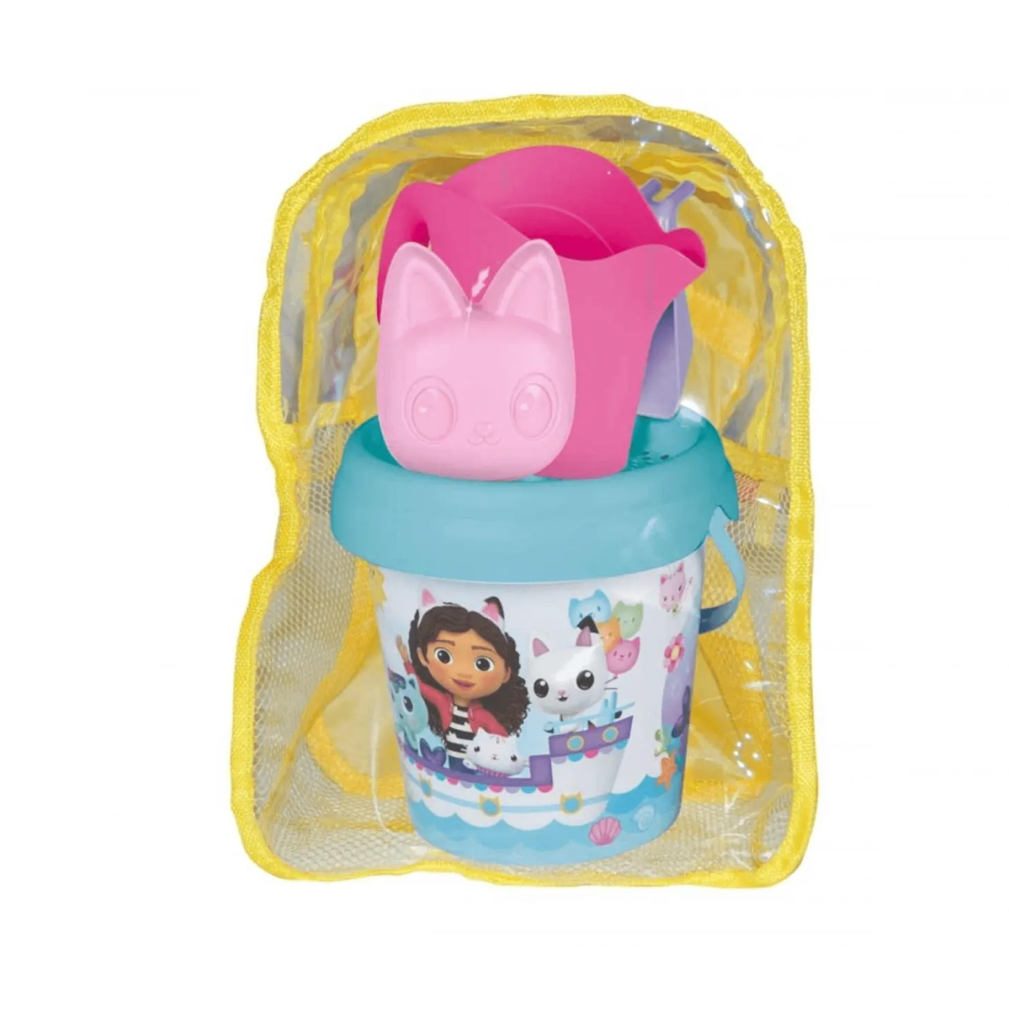 - ??? Set completo de playa: Incluye un cubo de 17 cm decorado con imágenes de Gabby, tamiz, pala, rastrillo, regadera y un molde para arena en forma de gatito.