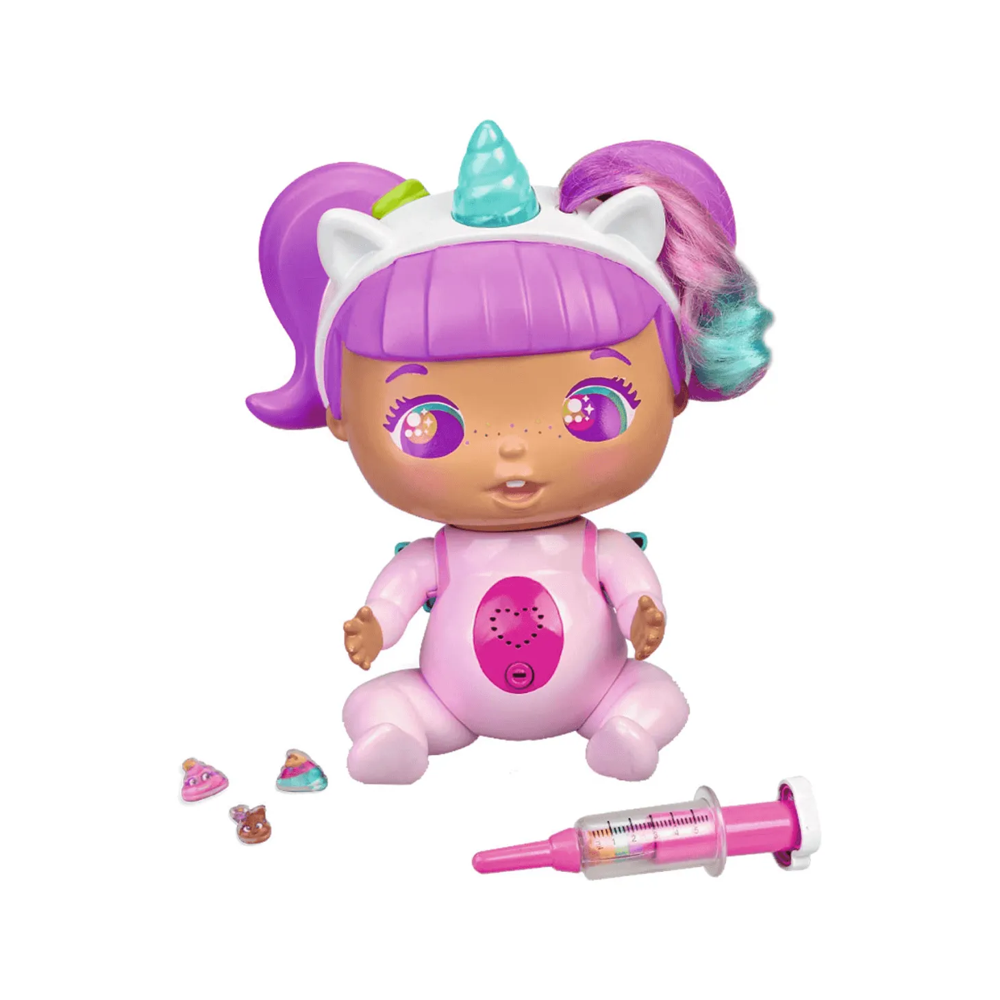 Si el cuerno se pone violeta es un indicador que nuestra Rosi- Rainbow hará caca. Ayúdala a sentirse mejor moviendo su hermosa cola. En unos minutos verás como salen de su colita las funnies poops. ¡Es divertidísimo!