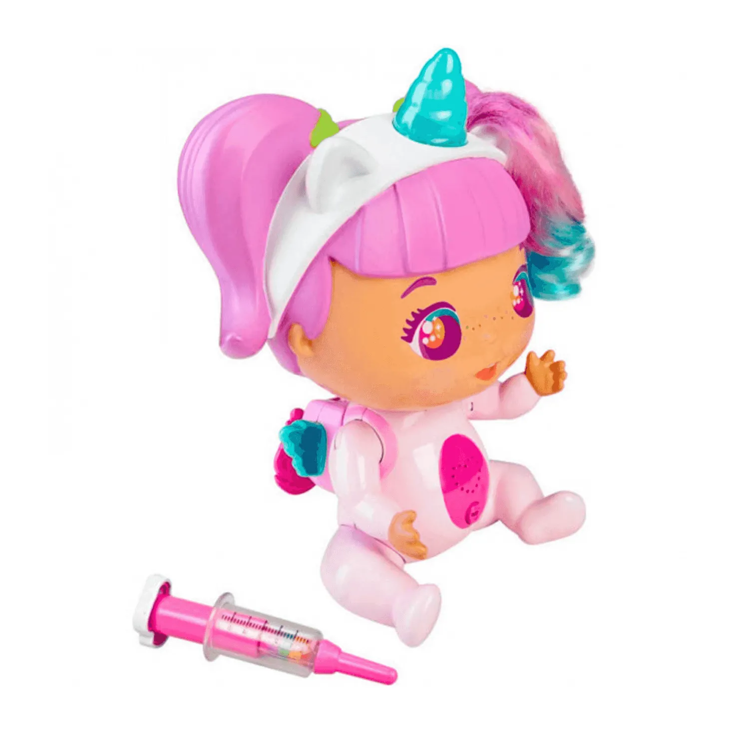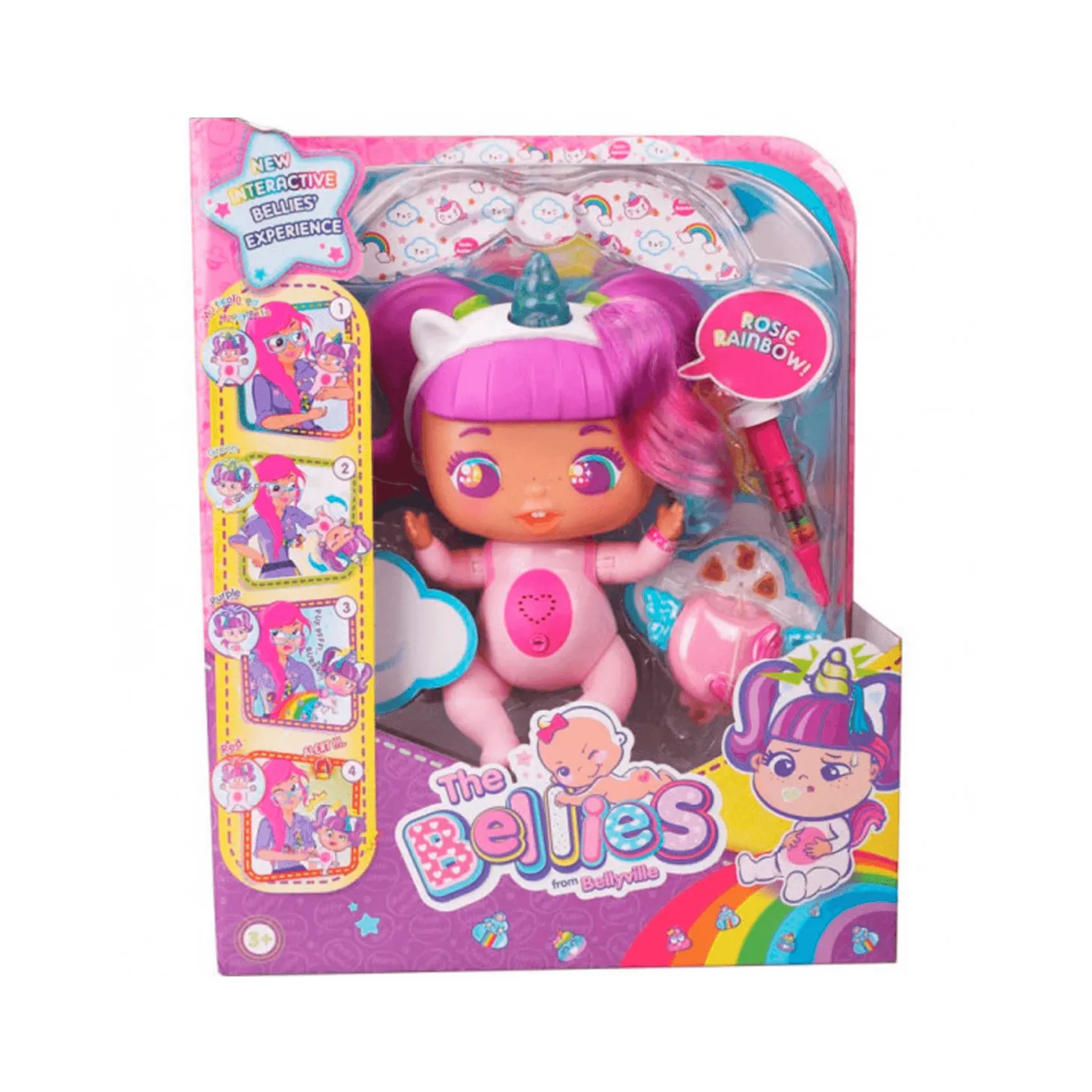 Cuidar a las Bellies no es una tarea sencilla y más si es Rosi-Rainbow, que es el primer ´Big Bellie´ (más alto que los otros Bellies). Enseña a tu niño o niña la importancia del cuidado de la salud de los bebés con esta muñeca unicornio.Rosi- Rainbow tiene un cuerno de luces de colores que cambia de color de acuerdo a su estado de salud.
