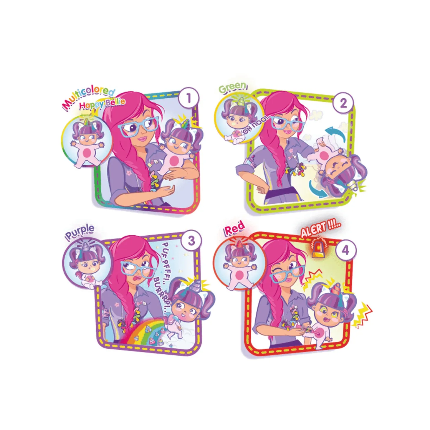 Rosi- Rainbow es una muñeca interactiva. Su característica principal es que tiene un cuerno de luces de colores que te indica como está Rosi Rainbow en cada momento. El color amarillo es un indicador que tiene dolor de estómago y comenzará a quejarse. Para calmarla, solo cárgala y mécela para que se sienta mejor.