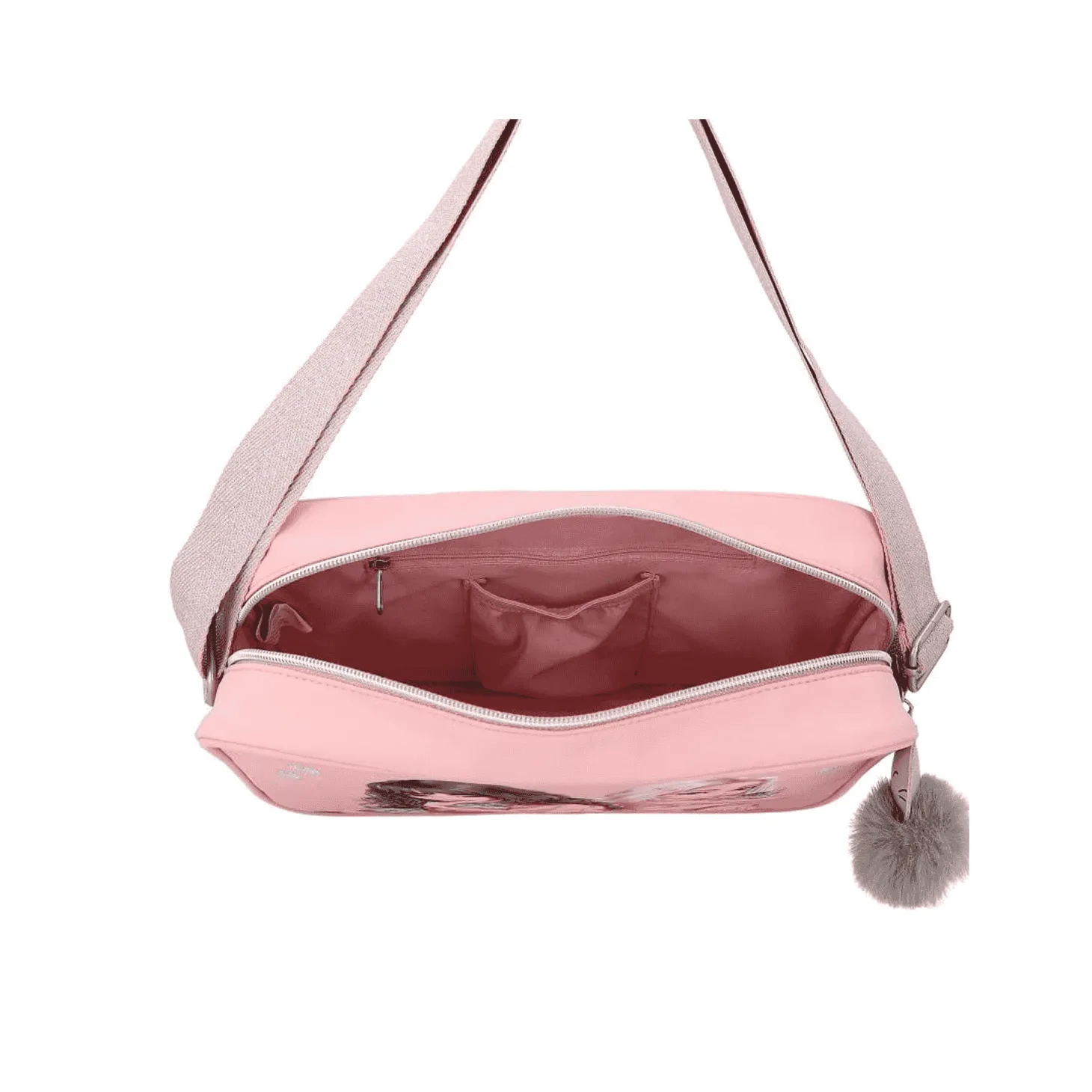 ¡Miau, guau! Este bolso bandolera color rosa empolvado de TOPModel lleva como motivo principal en la cara delantera modelos con tres gatitos monísimos y corazones plateados bordados. Además, incluye un extra ideal: un gatito de peluche colgando de la cremallera. La bandolera ajustable brilla ligeramente.
