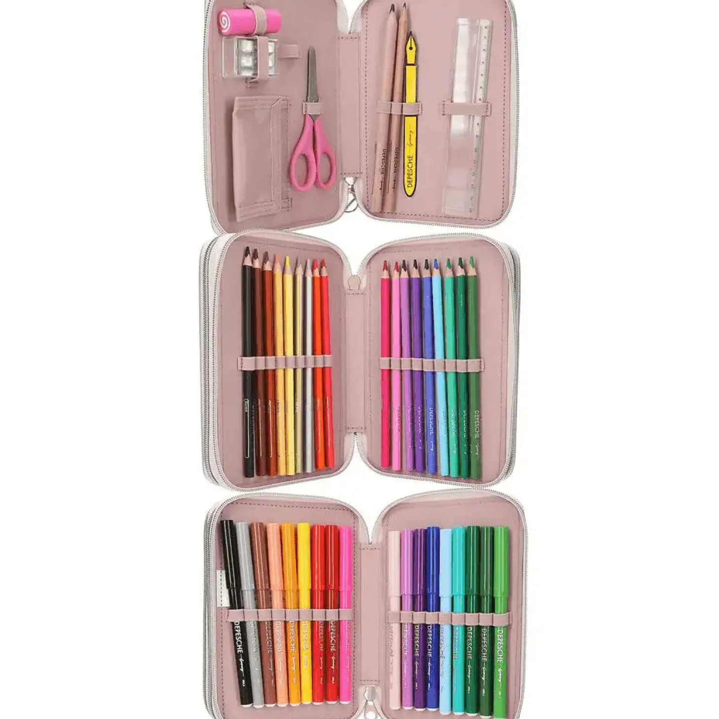 Descripción del producto: La cara delantera de este estuche de 3 pisos color verde salvia de TOPModel está adornada con un romántico motivo de una modelo rodeada de delicadas flores y mariposas, algunas de ellas bordadas. Los tres compartimentos separados vienen completamente llenos con 18 lápices de colores, 18 rotuladores, 2 lápices, sacapuntas, goma de borrar, regla, tijeras y pegamento en barra; el estuche incluso va provisto de un bolsillito interior con cierre de velcro. Material: poliéster 100 por 100.