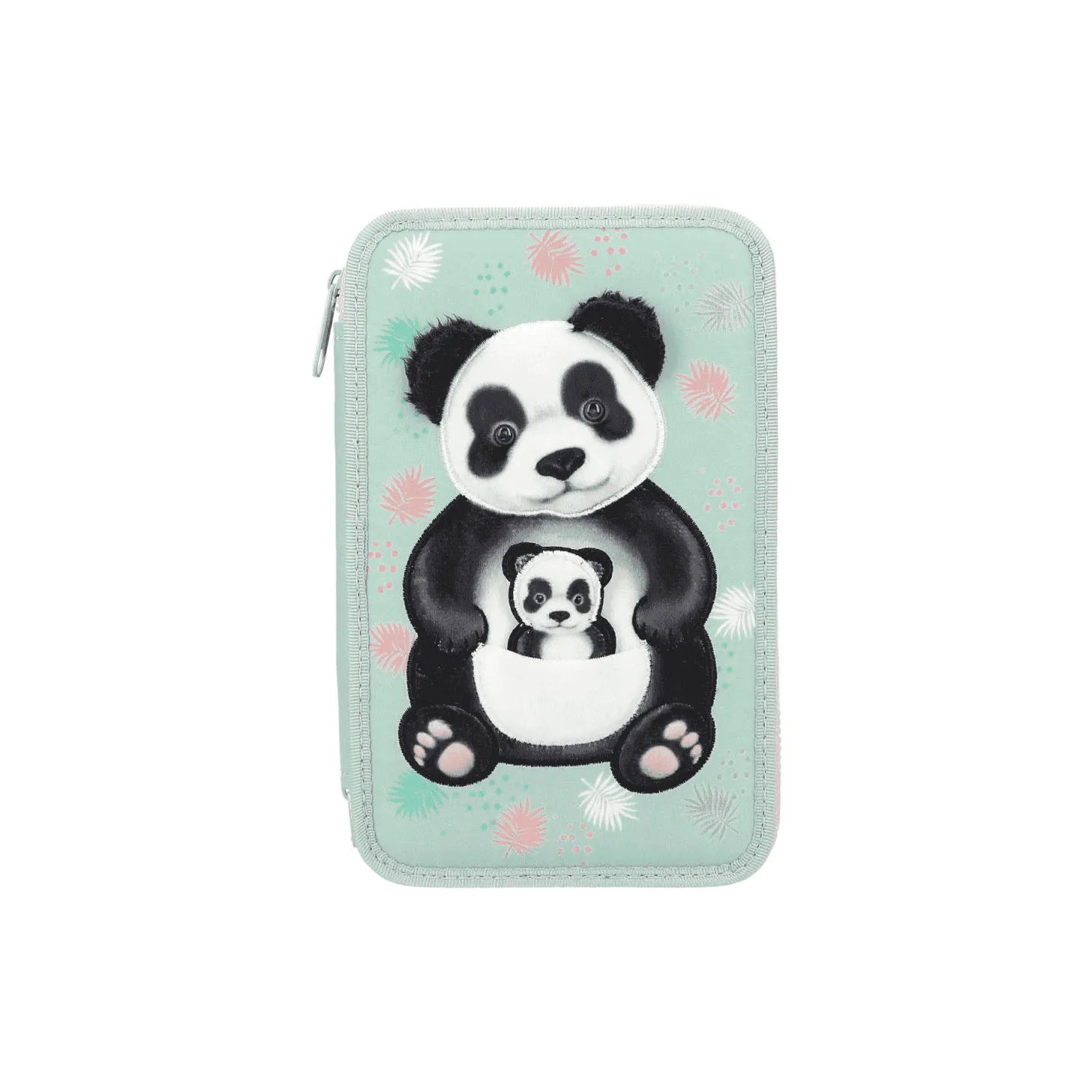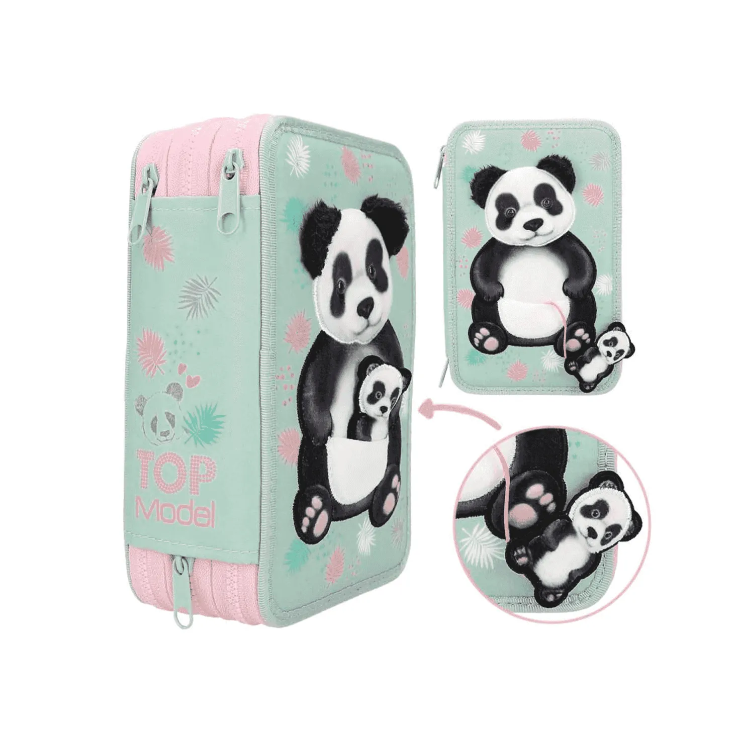 ¡Qué ositos tan monos! Este estuche verde suave de TOPModel lleva en la cara delantera la aplicación de un panda grande con una cría en un bolsillo que forma su tripita. La cría es extraíble parcialmente y está sujeta a la madre con un cordón, lo que añade un detalle adorable y funcional al diseño. El estuche tiene un encantador estampado de hojas, perfecto para los amantes de la naturaleza y los animales.