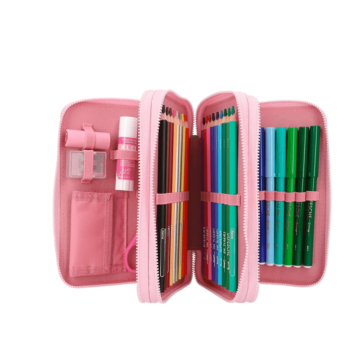 - Totalmente Equipado: Incluye 18 lápices de colores, 18 rotuladores, 2 lápices, goma de borrar, sacapuntas, regla, tijeras, pegamento en barra y un pequeño bolsillo con cierre de velcro.