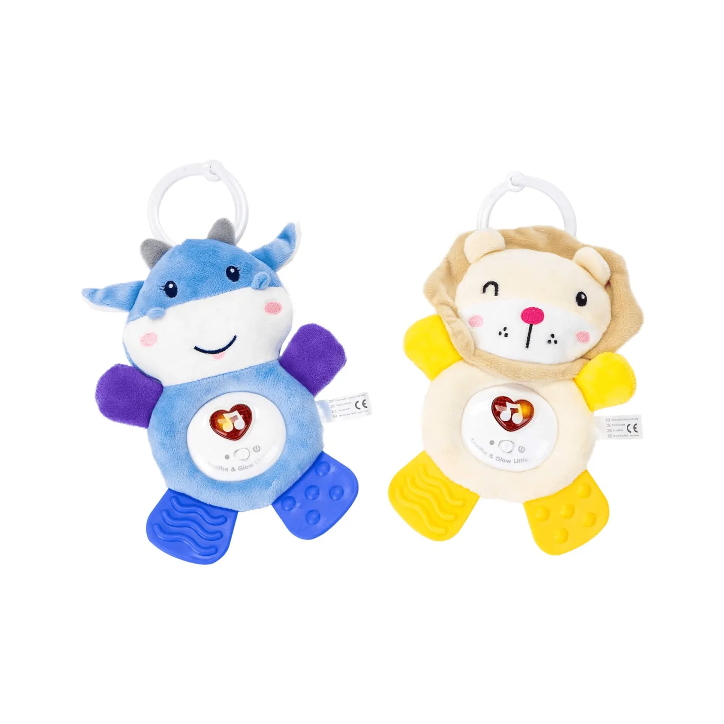 ¡Calma e ilumina! Con luces y música. Frota para emitir la voz. Luces y música relajantes. Cuenta con mordedor de gel con goma en las patitas del animalito. Seguro y no tóxico. Contiene un gancho circular para que puedas colgarlo en la cuna del bebé. Hay dos modelos diferentes: vaquita y leoncito. Se venden por separado. Se recomienda para bebés a partir de 6 meses.