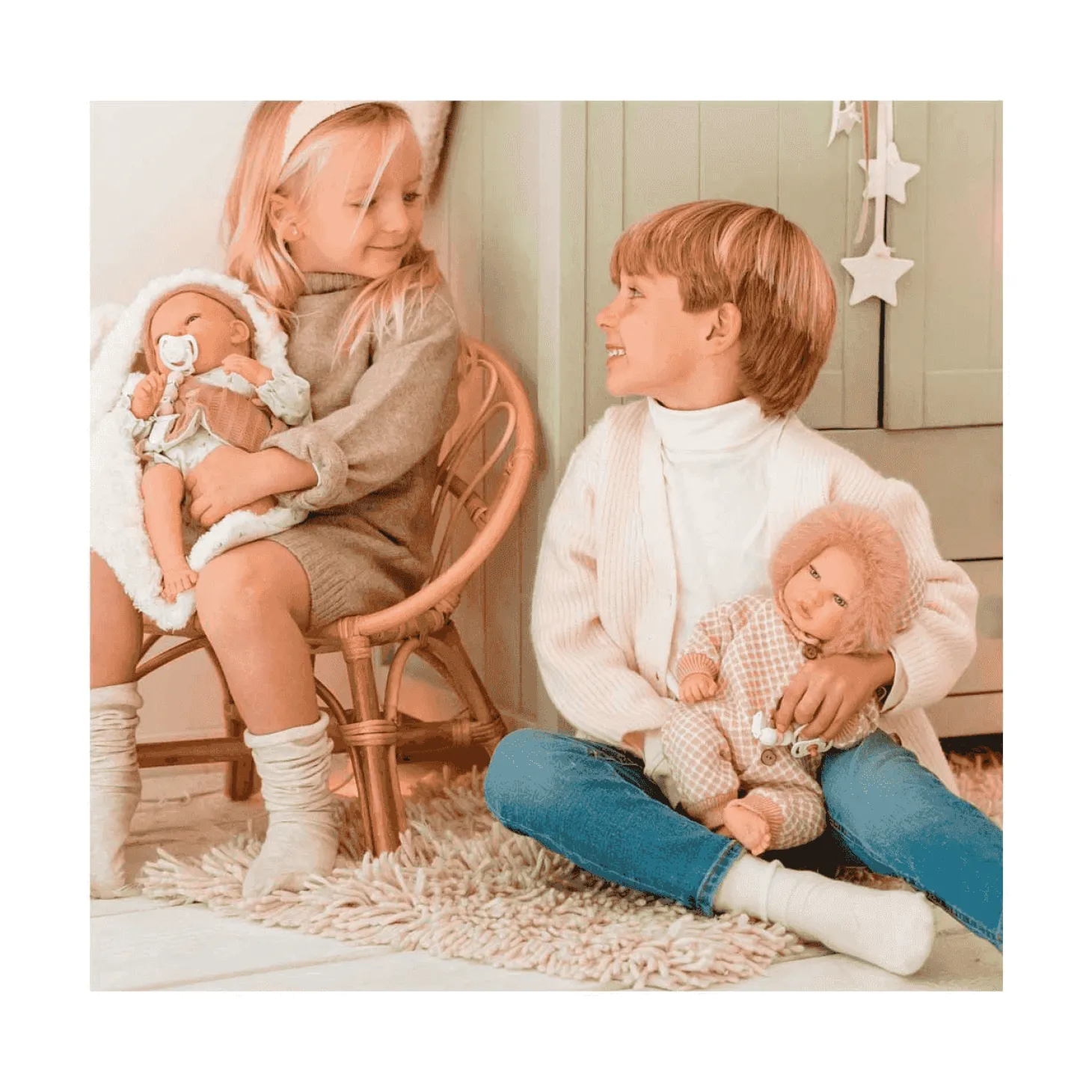 Su cuerpo de vinyl permite aplicarle detalles muy realistas como piel sonrosada, venitas y decoración de las uñas. Su ropita, bolso y cojín se han confeccionado con tejidos de alta calidad cuidando al máximo cada detalle de su diseño.