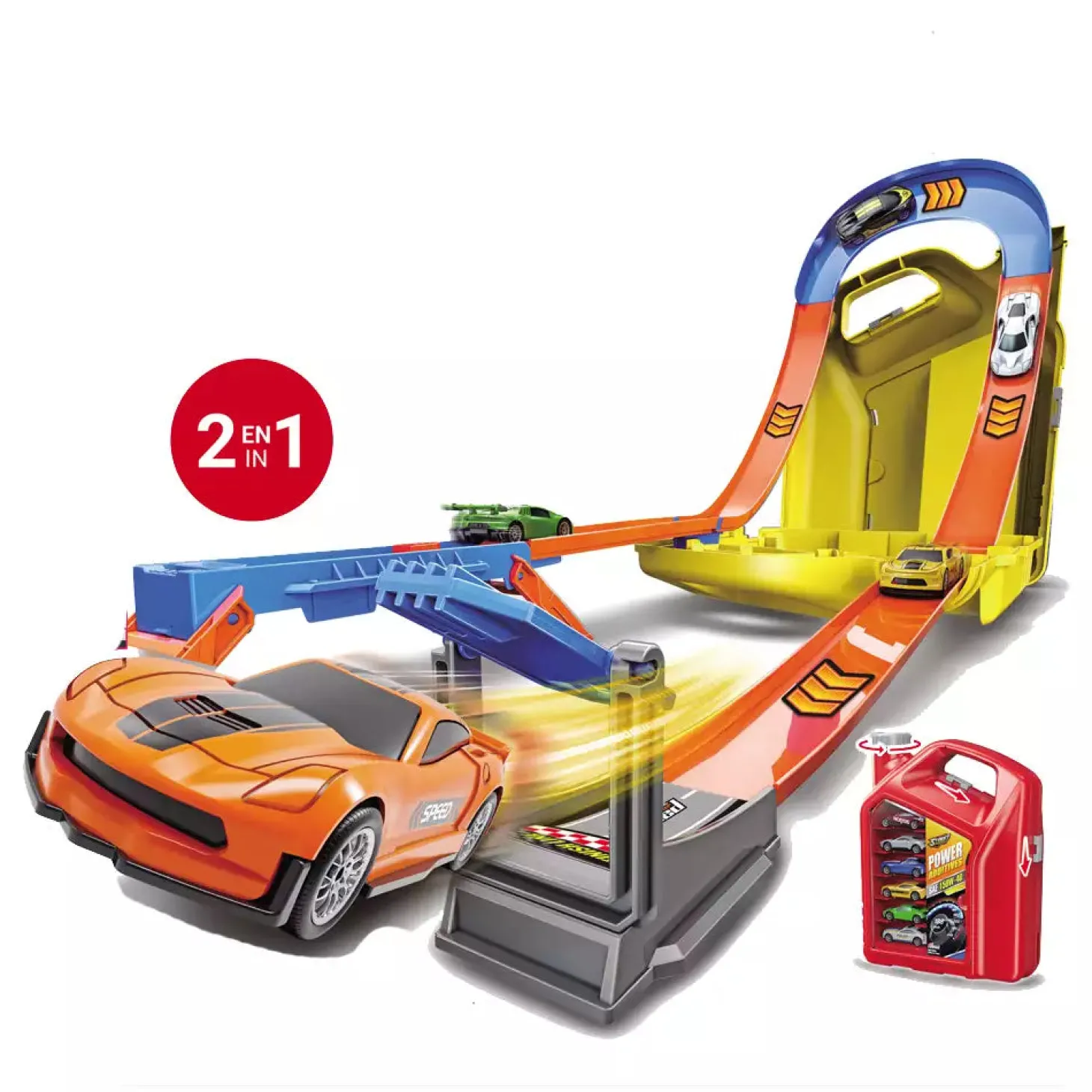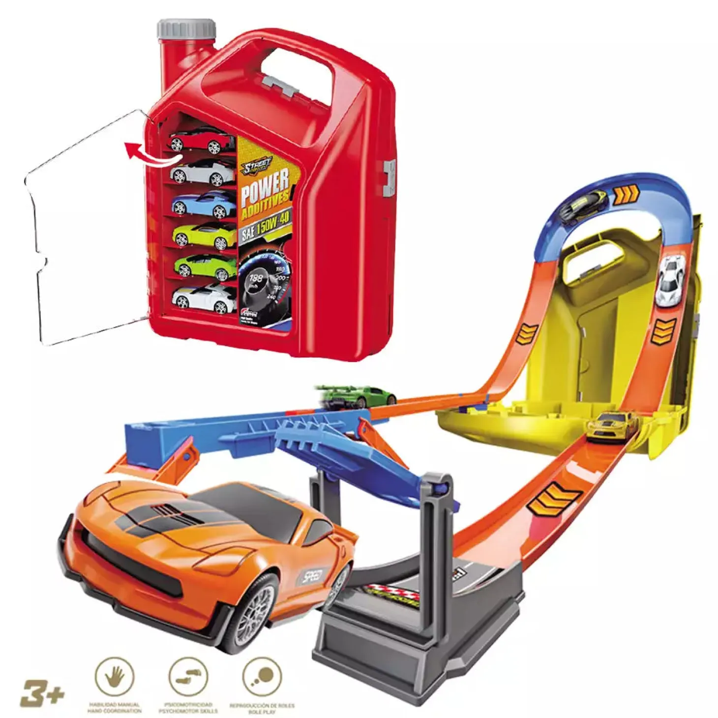 - Diseño 2 en 1: un bidón de aceite portátil que se abre y se transforma en una pista de carreras.