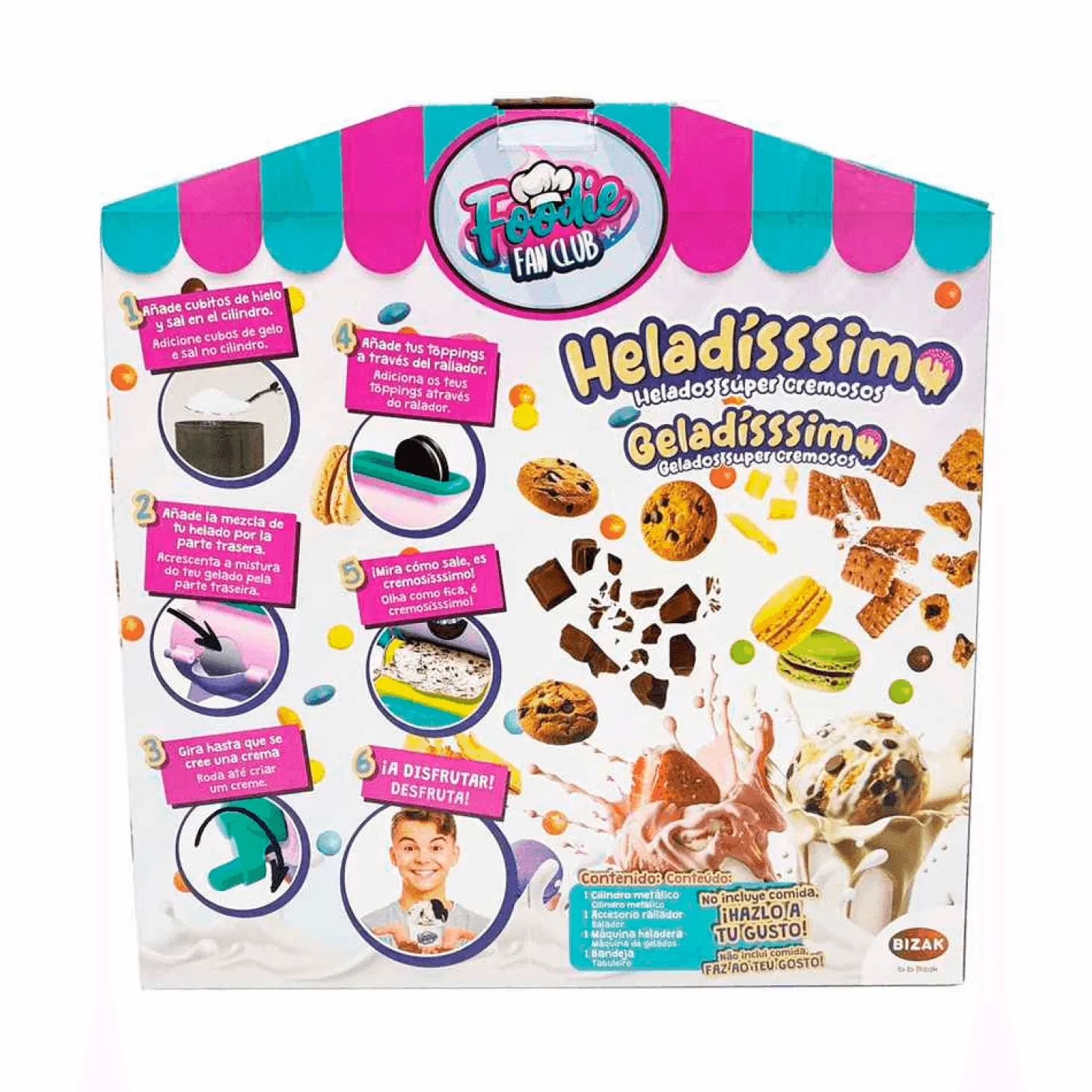 - Contenido del set: 1 máquina de hacer helados, 1 tarrina, 1 cuchara y 1 libro de recetas.