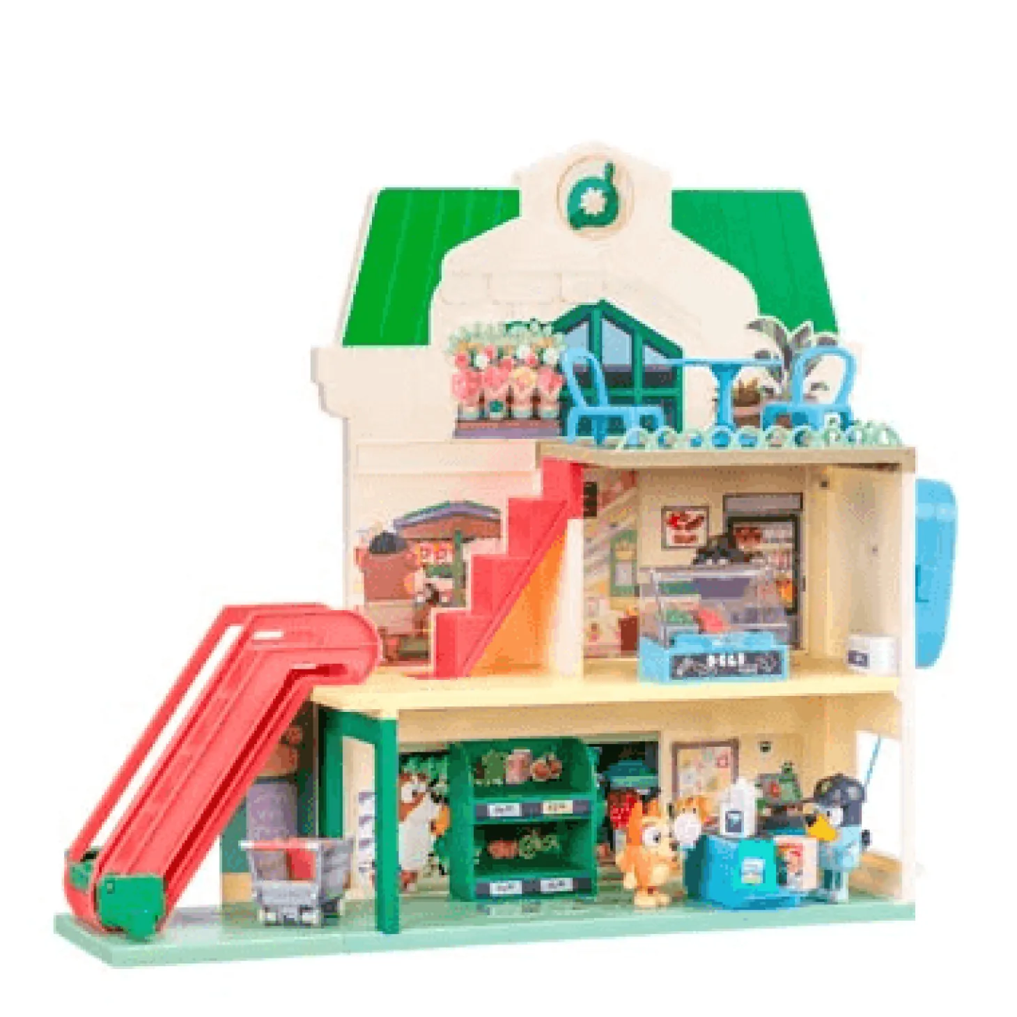 Lleva la aventura del universo Bluey al salón con el Bluey Supermarket Playset, un set ideal para fomentar la imaginación y el juego simbólico. Inspirado en el episodio “Kids”, este juguete permite recrear escenas divertidas en una tienda de 3 niveles: comprar, atender y jugar con los personajes favoritos.