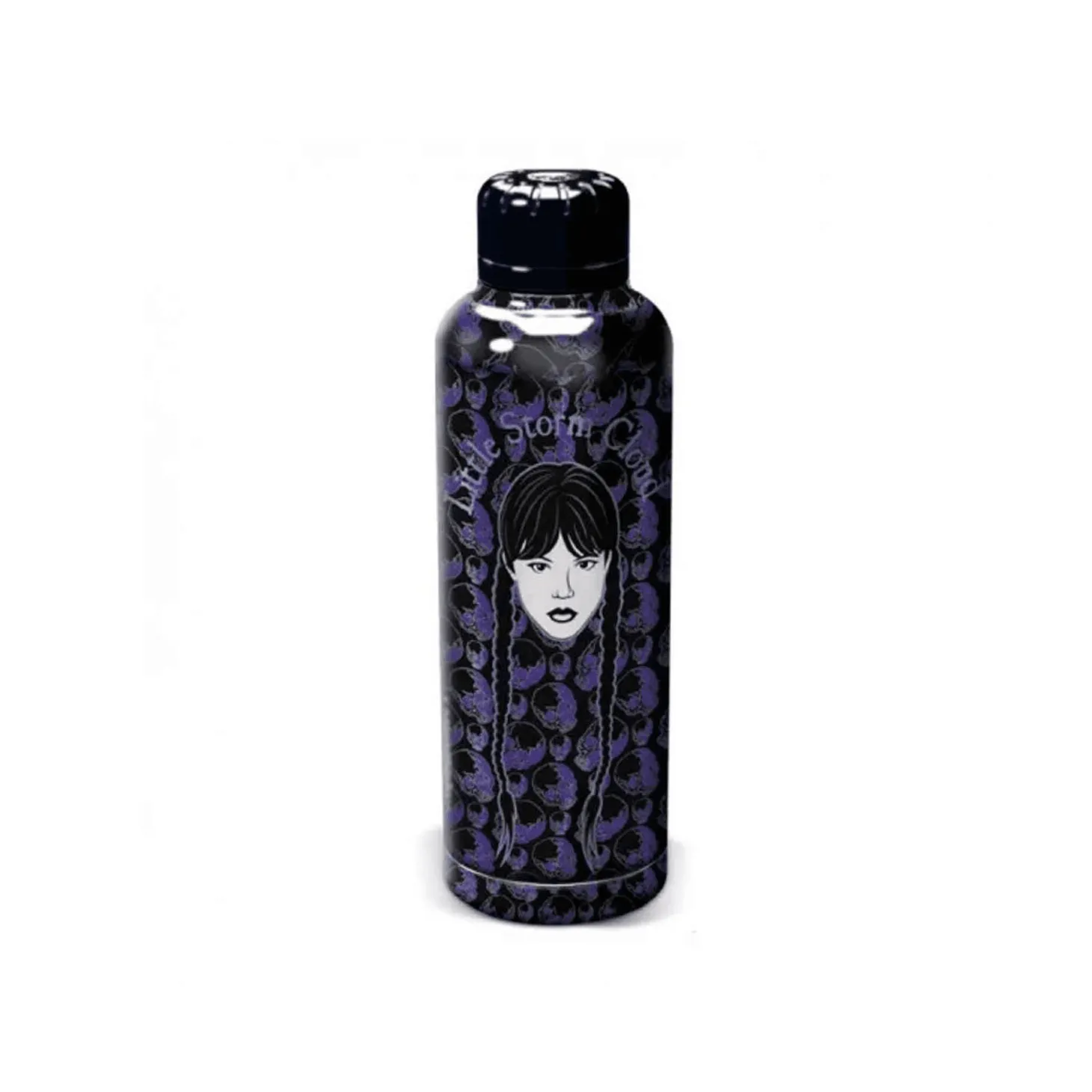 La Botella Termo Miércoles es una botella de agua reutilizable y térmica de acero inoxidable con doble aislamiento, diseñada para satisfacer tus necesidades de hidratación manteniendo tus bebidas a la temperatura ideal.