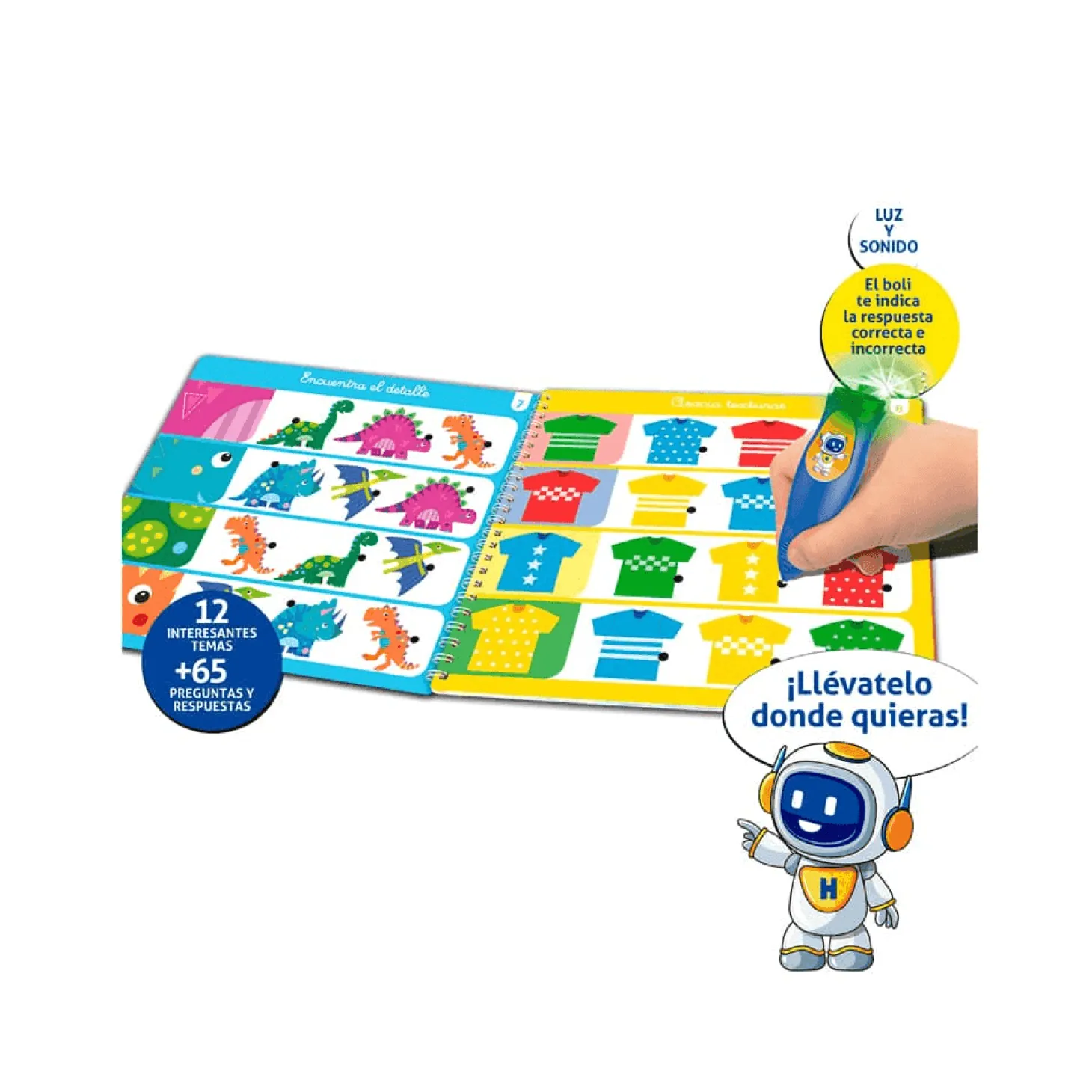 - Bolígrafo interactivo: Incluye un bolígrafo con luz y sonido que indica cuándo las respuestas son correctas, proporcionando una retroalimentación inmediata que motiva al niño.