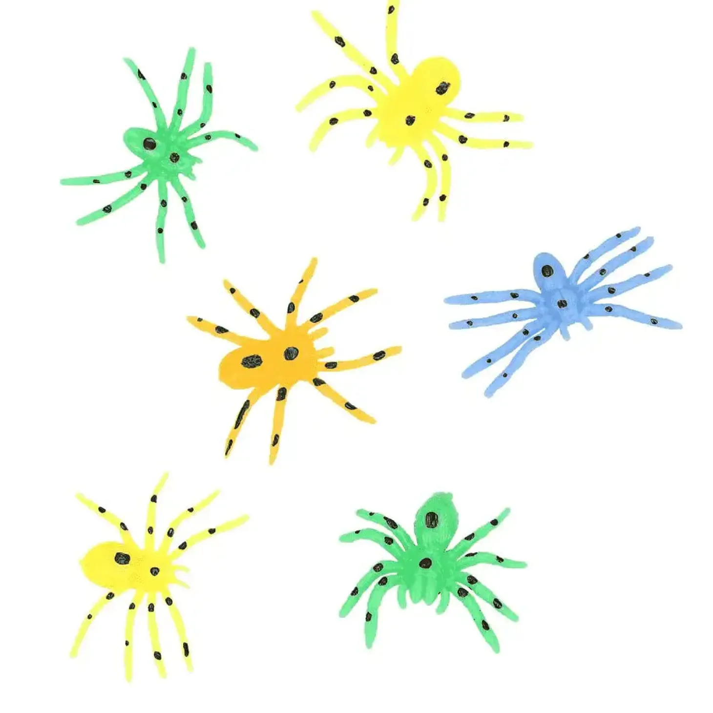 Descripción del producto: ¡Atención, arañas! Estas chulísimas arañas de plástico son muy guay y, además, se ilumien la oscuridad. El set se compone de 6 arañas: amarillo, naranja, azul y verde (al menos una araña de cada color). De Adventure World.