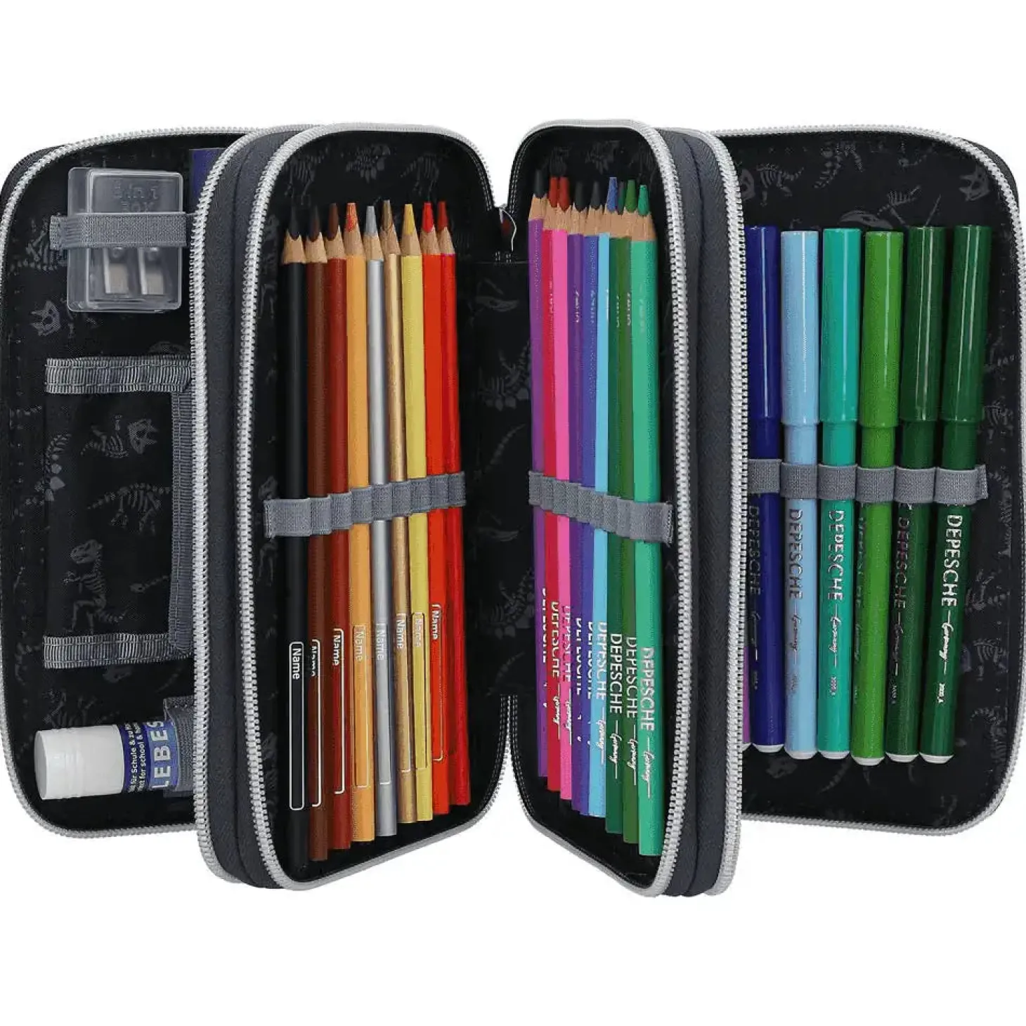Descripción del producto: Galácticamente chulo. Este estuche azul marino de Dino World destaca por el genial diseño de dos temibles tiranosaurios rex sobre fondo de galaxias. Lo mejor: Al presionar el botón ‘start’ se ilumidurante 20 segundos aprox. los ojos y las fauces de los dinosaurios, así como los planetas. Los tres compartimentos separados vienen completamente llenos con 18 lápices de colores, 18 rotuladores, 2 lápices, sacapuntas, goma de borrar, regla, tijeras y pegamento en barra; el estuche también viene provisto de un pequeño bolsillo con cierre de velcro. Material: poliéster 100 por 100.