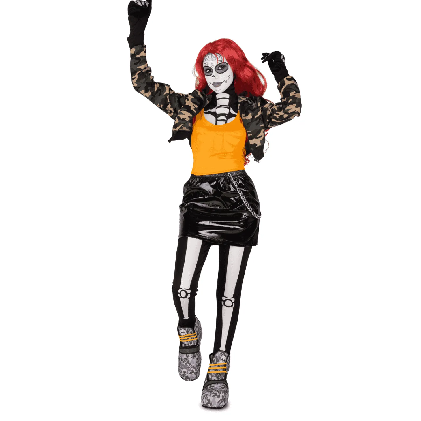 ¿Qué incluye? incluye camiseta, chaqueta con capucha, guantes, cubrebotas, leggings, falda con cadena, chorrera esqueleto, peluca, 2 sets de tattoos, espo nja, maquillaje blanco y maquillaje morado.