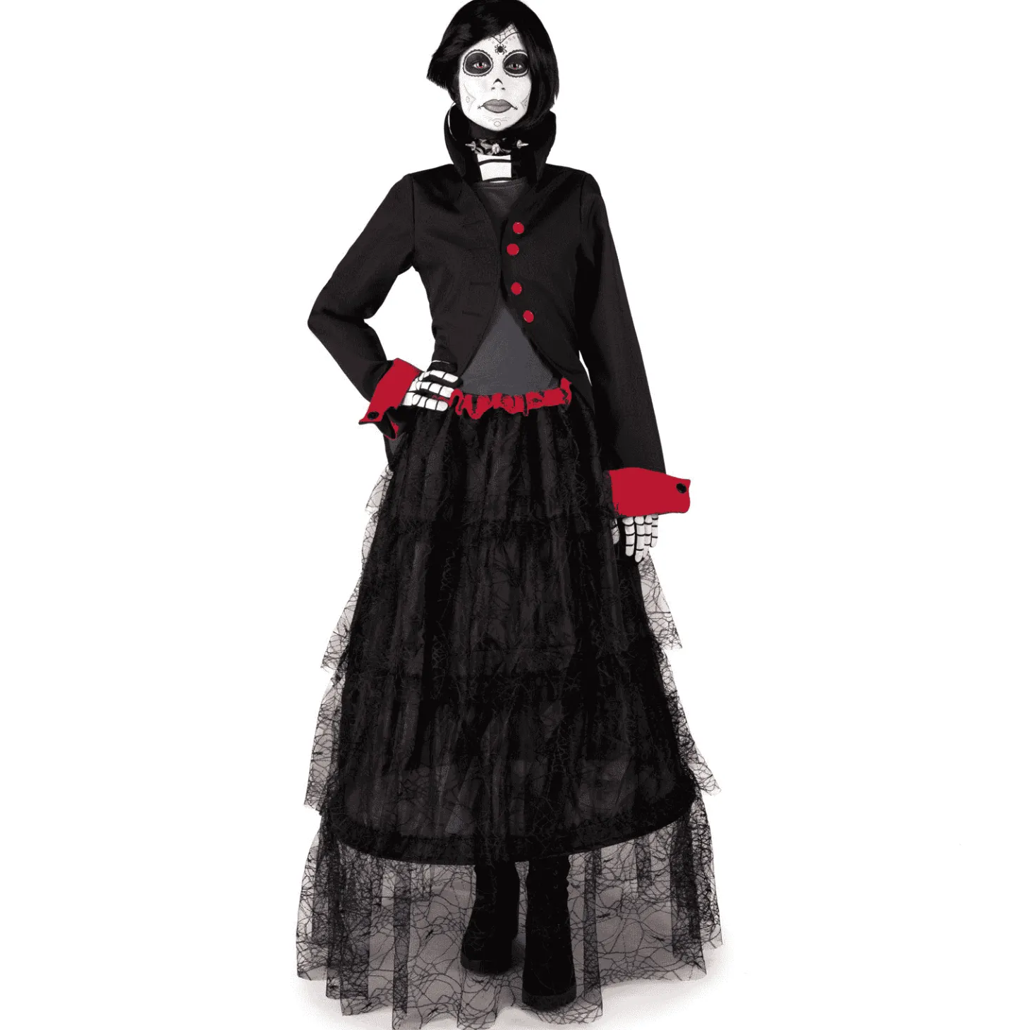 ¿Qué incluye? incluye vestido, chaqueta, guantes, chorrera esqueleto, gargantilla, peluca, 2 sets de tattoos, esponja, maquillaje blanco y maquillaje negr o.