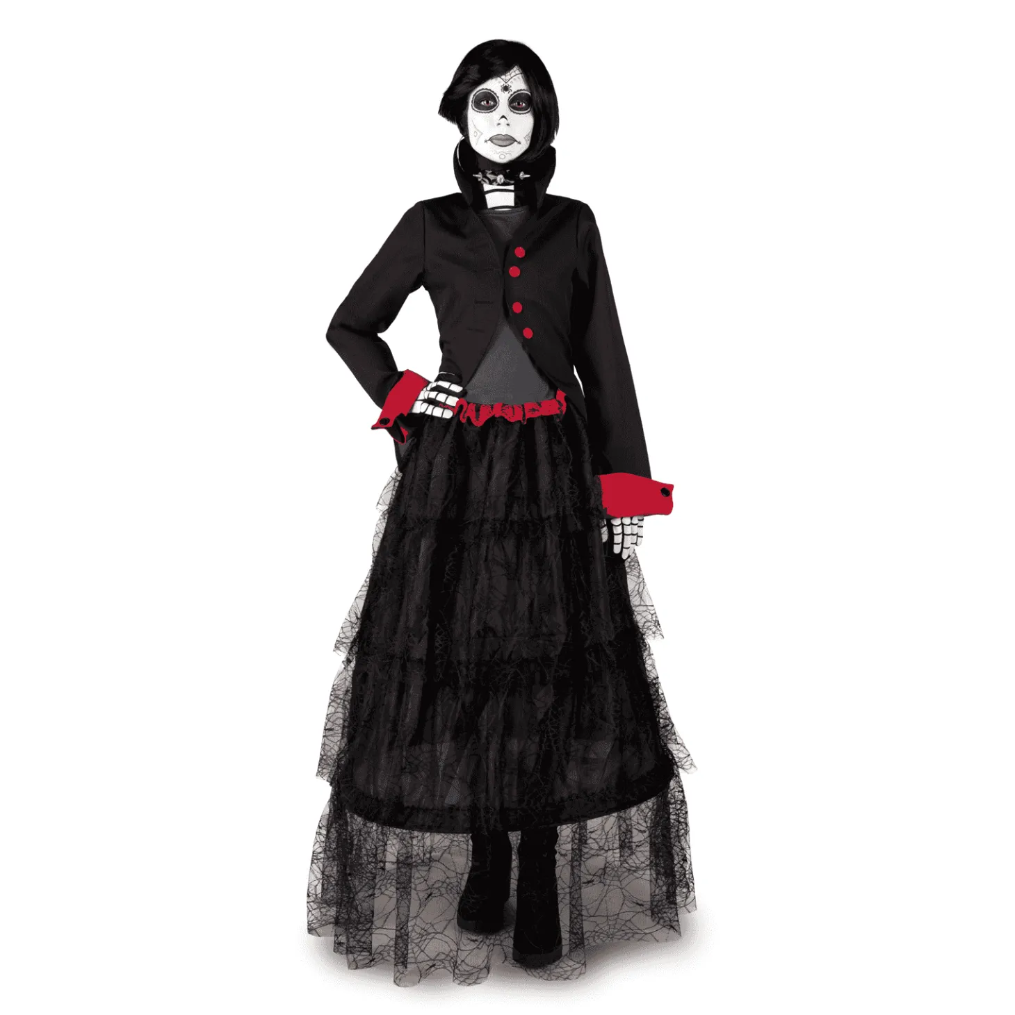 ¿Qué incluye? incluye vestido, chaqueta, guantes, chorrera esqueleto, gargantilla, peluca, 2 sets de tattoos, esponja, maquillaje blanco y maquillaje negr o.