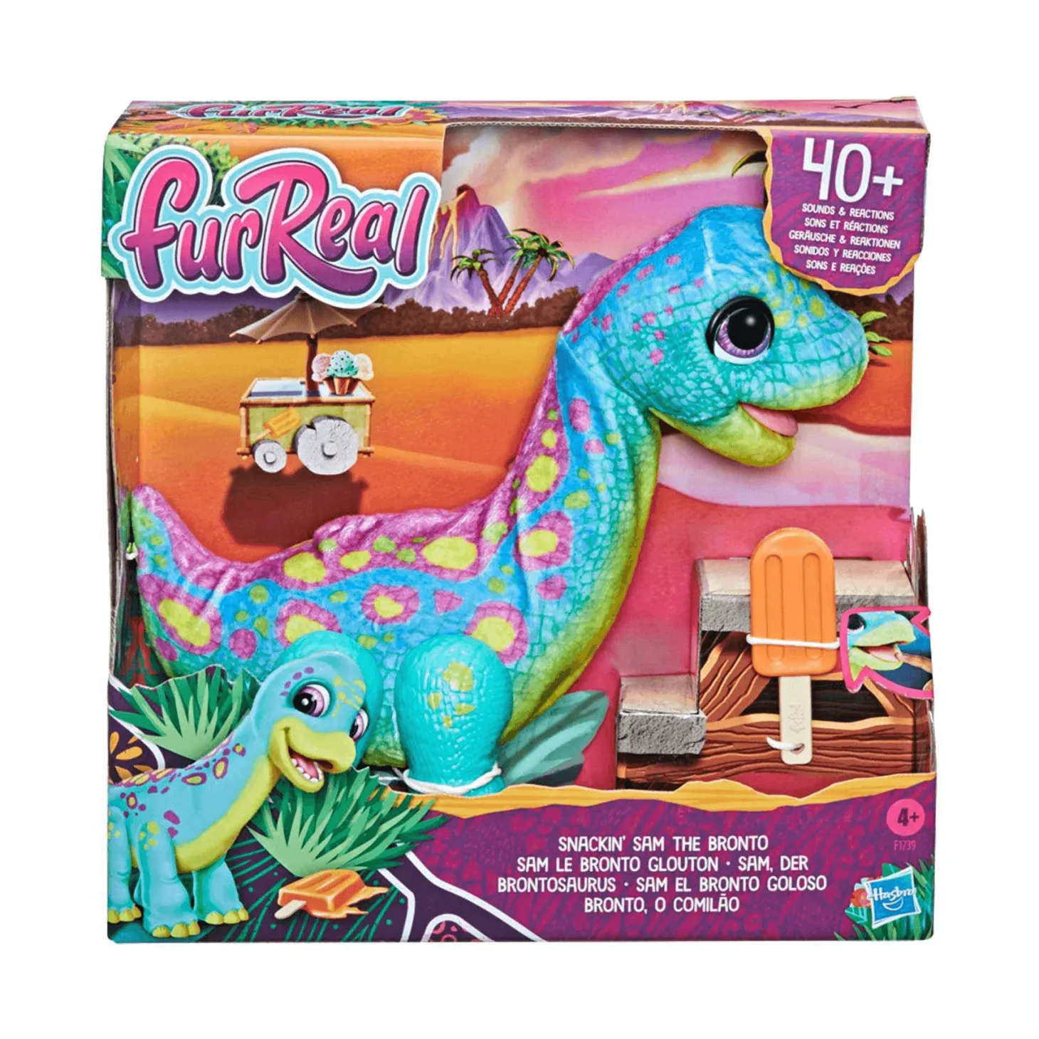 Cuenta con una altura de 30 cm de alto, un ancho de 11 cm, un largo de 33 cm y un peso de 1,13 kilogramos. La caja incluye el juguete del Brontosaurio Furreal Friends, que funciona con baterías (incluidas). Trae también un paleta de helado de juguete para dar de comer a la figura del dinosaurio. Los colores característicos son el azul y el verde, haciendo alusión al color de algunos de los dinosaurios de la prehistoria.