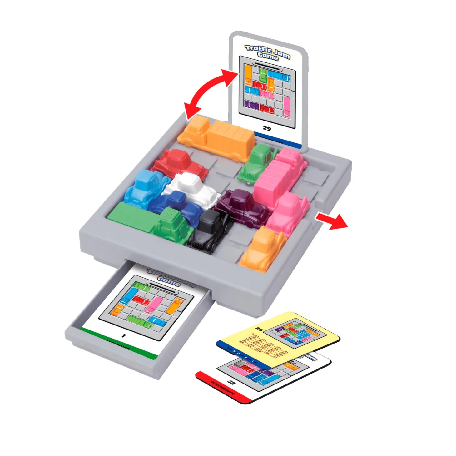 - Tablero de Tráfico y Vehículos: Incluye un tablero con piezas de diferentes formas y colores que simulan vehículos y obstáculos.