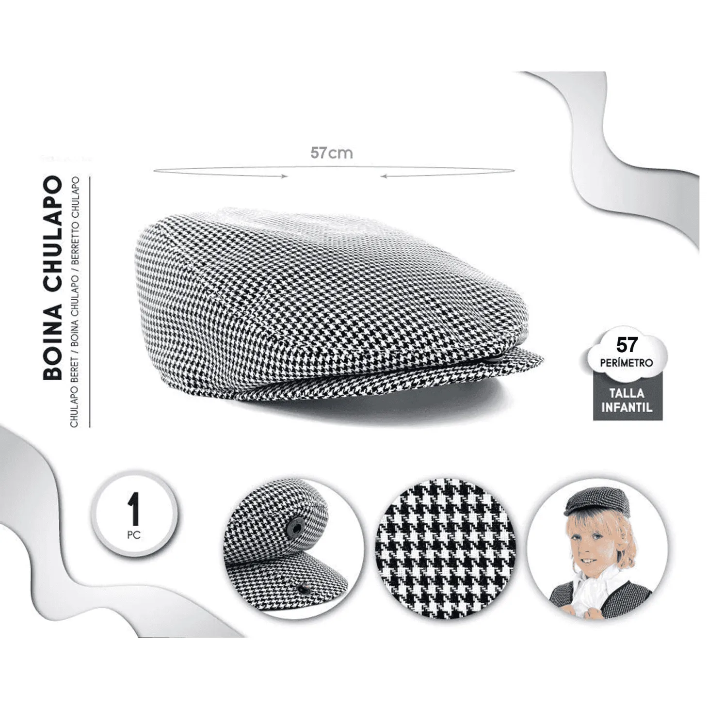 Si quieres vivir las fiestas con auténtico sabor castizo, la Gorra Chulapo Talla 57 es el complemento perfecto para tu atuendo. Esta gorra, con su diseño de cuadros tradicionales en blanco y negro, te hará lucir como un verdadero madrileño en cualquier verbena, desfile o evento cultural.
