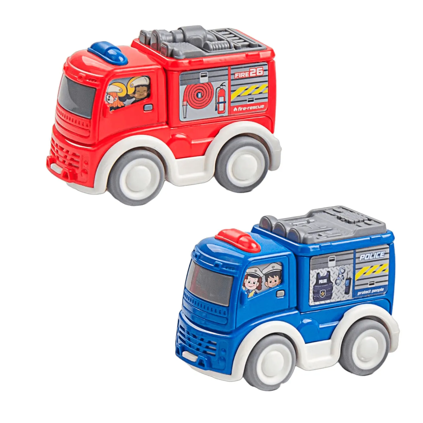 El Camión de Emergencias de Infant Planet viene con luces, sonidos y funciona a fricción. Disponible en modelos de policía y bomberos para niños de 2 años en adelante.