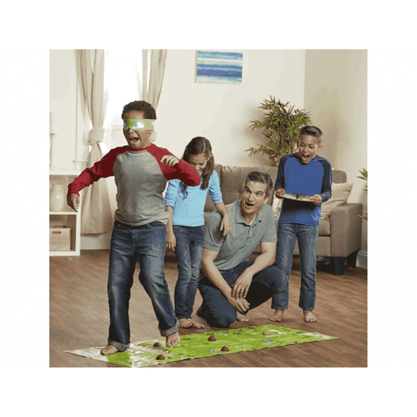 - Ponte una venda, gira la ruleta, y luego avanza el número de pasos indicado por el tapiz de juego