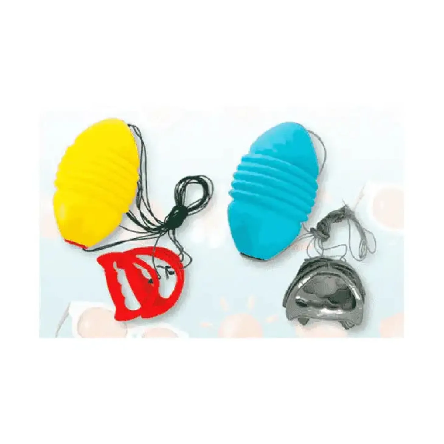 ¿Cómo funciona? Muy fácil: solo coloca el proyectil (en forma de cápsula de colores) en el centro de la cuerda, estira las asas y suelta con fuerza. ¡Verás cómo sale disparado hacia tu compañero! Este sistema estimula los reflejos, la precisión y la coordinación motora, además de ser un excelente ejercicio físico al aire libre.