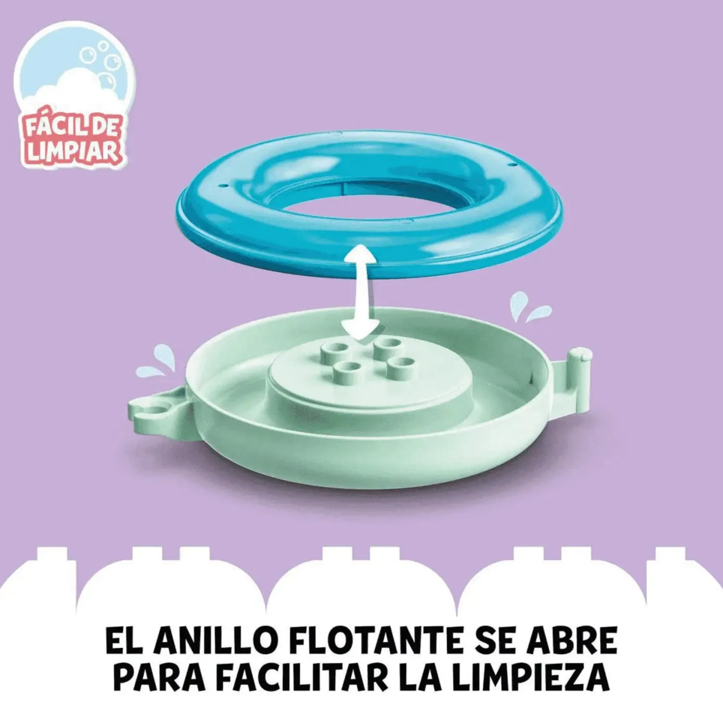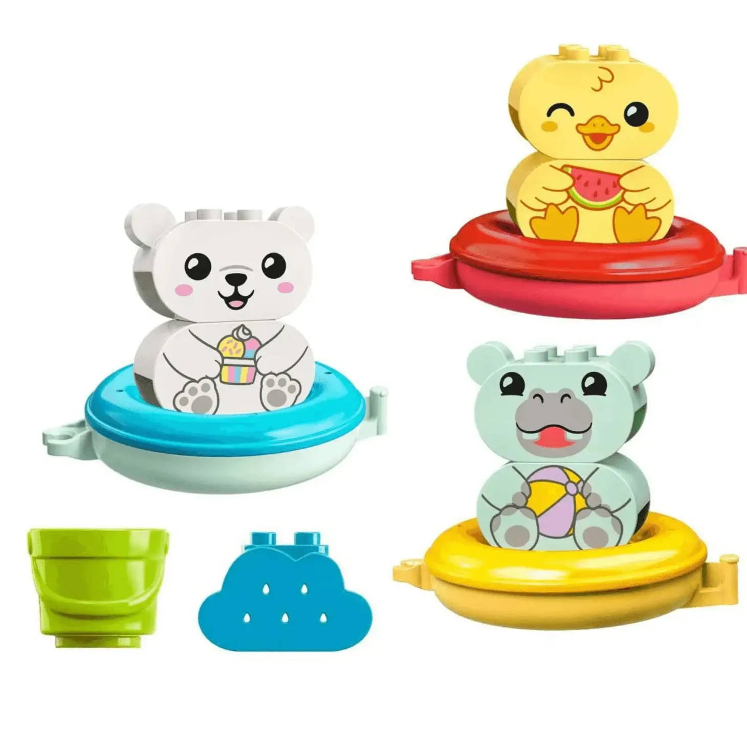 - Animales construibles: El juego incluye un hipopótamo, un pato y un oso polar, además de un cubo, una nube de lluvia y 3 flotadores que se abren para limpiarlos rápida y fácilmente
